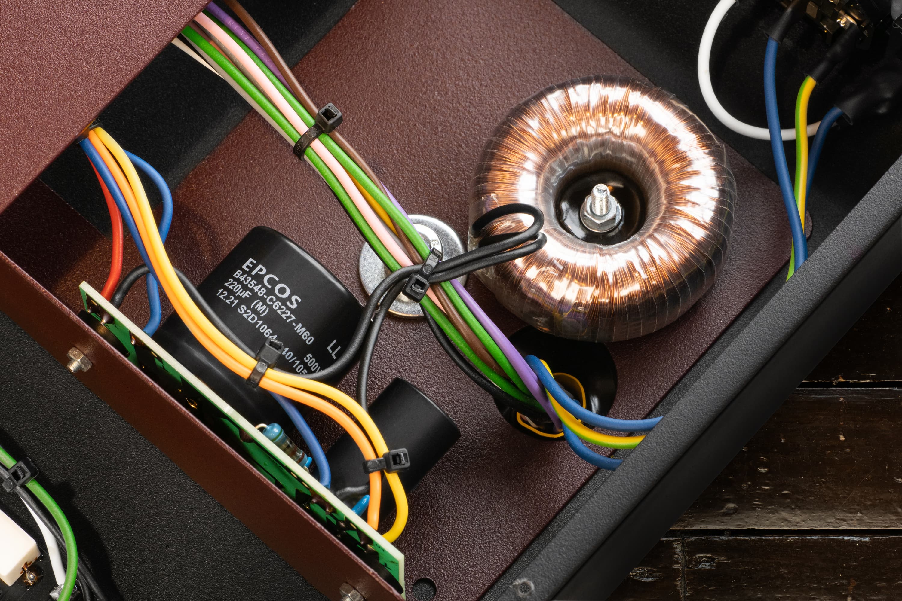 В «полевых условиях» студии нам не удалось снять кожухи с трансформаторов — закреплены они отлично, да еще и имеют общие крепежи с другими компонентами. Некоторое время назад мы запрашивали у производителя изображения используемых трансформаторов, можно взглянуть на них в соответствующем обзоре, внешние различия здесь минимальны.