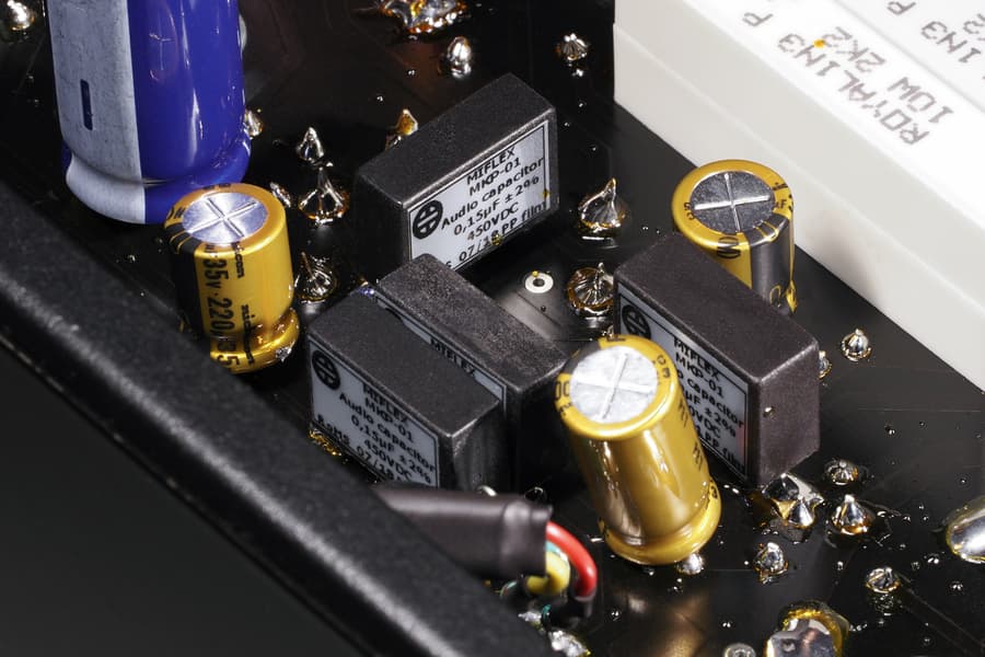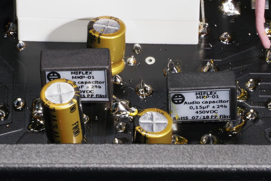 ...и японской Nichicon. Ну и, конечно, полипропиленовые польского производителя Miflex. Собираются усилители Fezz Audio вручную, качество пайки... спорное, скажем так. Выглядит не очень аккуратно, но на эксплуатационные свойства никак не влияет. Да и вряд ли рядовой пользователь будет заглядывать внутрь усилителя, а с экстерьером у него всё замечательно.