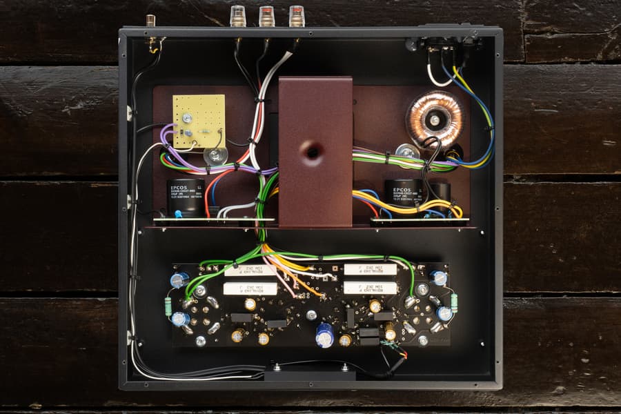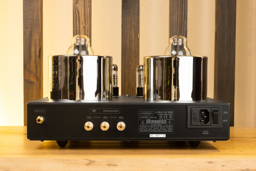 Видимо, примерно так рассуждали инженеры Fezz Audio, решившие «разделить» интегральный Mira Ceti 300b на два моноблока, получивших то же название, но с приставкой «mono power amplifier». Вернее, конечно, не просто разделить, а сделать на его основе полновесные устройства: в каждом из моноблоков трудятся в поте лица сразу два комплекта ламп: уже упомянутые выше выходные 300B и отвечающие за их «раскачку» 6SN7.
