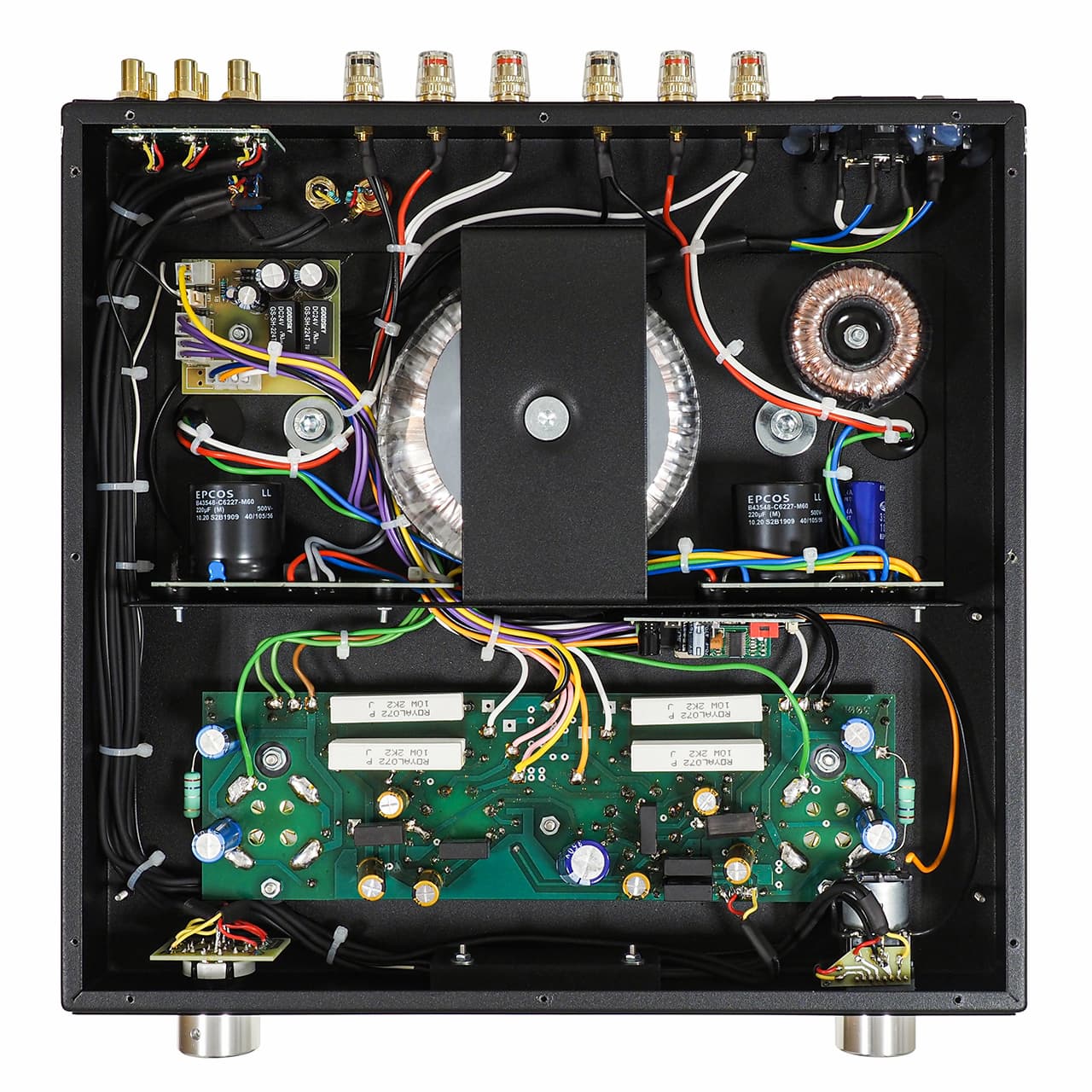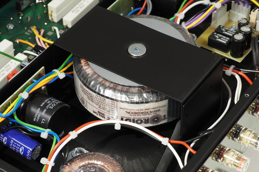 По центру находится внушительных размеров трансформатор питания. Судя по маркировке, создан он специально под рассматриваемый усилитель — производитель вполне может себе такое позволить.