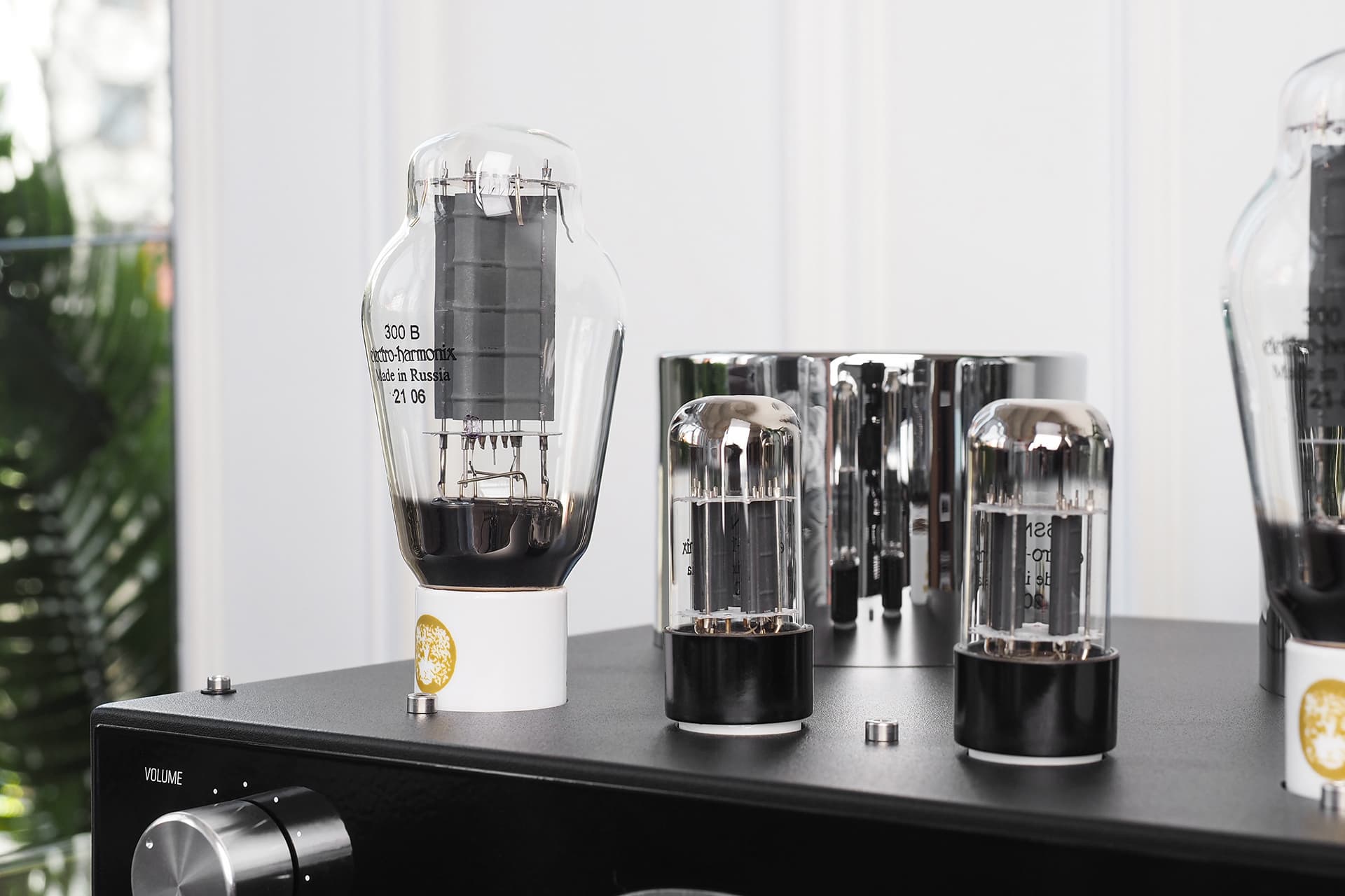 Про лампы мы уже поговорили во введении: предварительный каскад построен на двойном триоде 6SN7, а на выходе работает легендарная 300В.