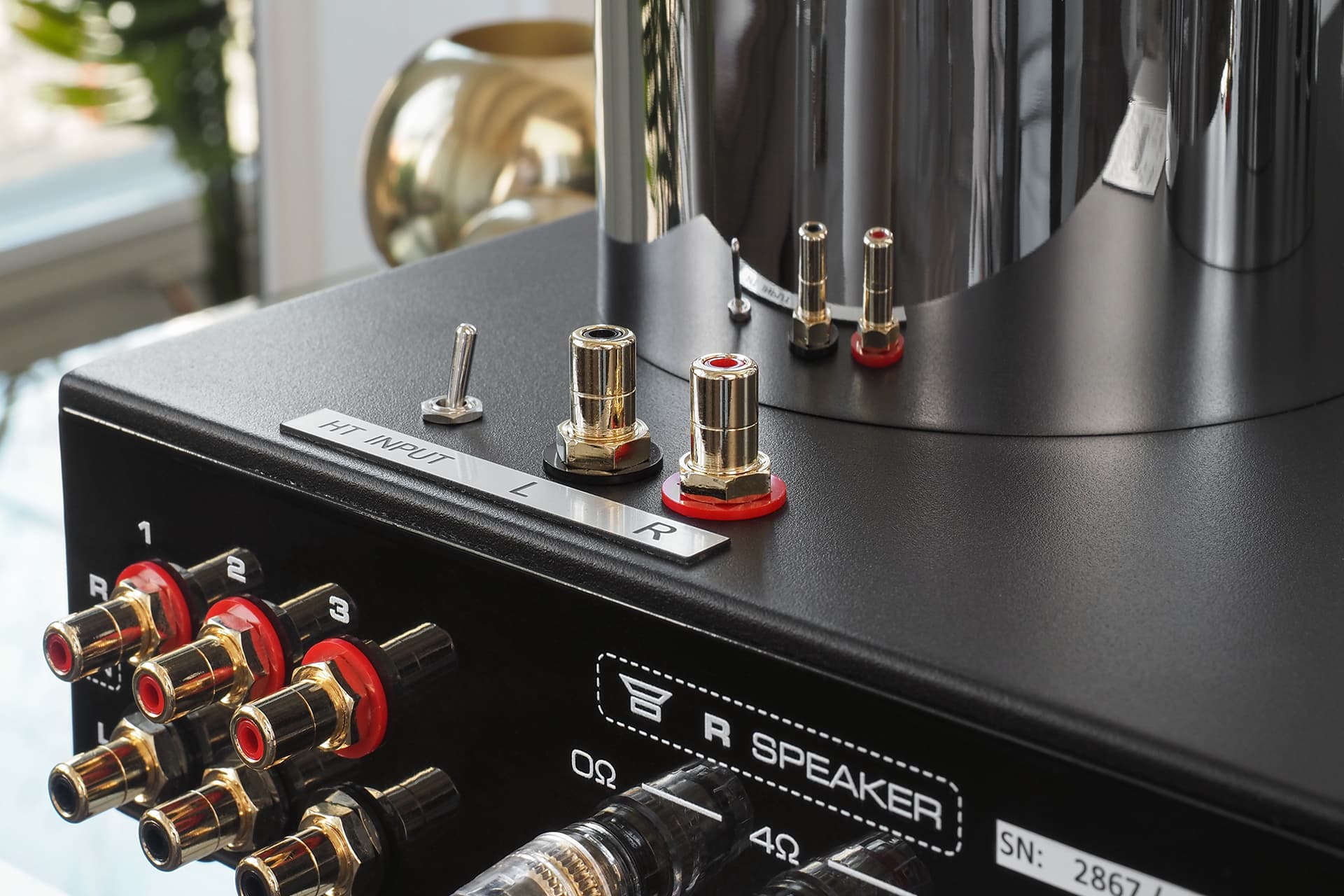 С источниками звука все просто — используем входы 2×RCA, не забываем выбрать нужный с помощью регулятора на передней панели. Также у Fezz Audio Mira Ceti есть оснащенный собственным выключателем вход HT (Home Theater), который отправляет сигнал сразу на драйверный каскад, минуя селектор входов и регулятор громкости. Это позволяет использовать подключенную к усилителю акустику в составе домашнего кинотеатра.