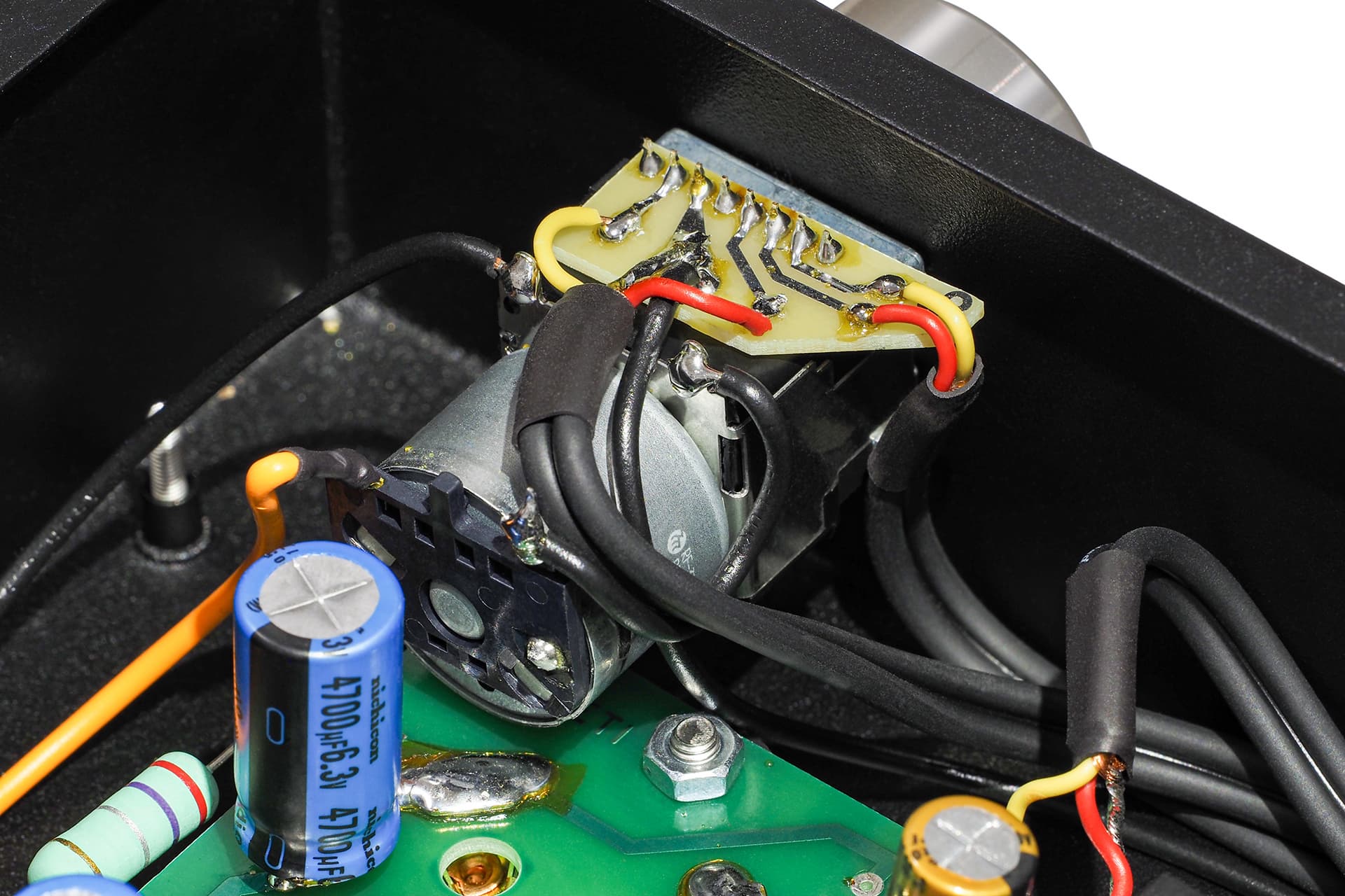 Регулятор громкости снабжен электроприводом, обеспечивающим его движение при нажатии кнопки на пульте дистанционного управления. С другой стороны передней панели находится трехпозиционный переключатель входов.
