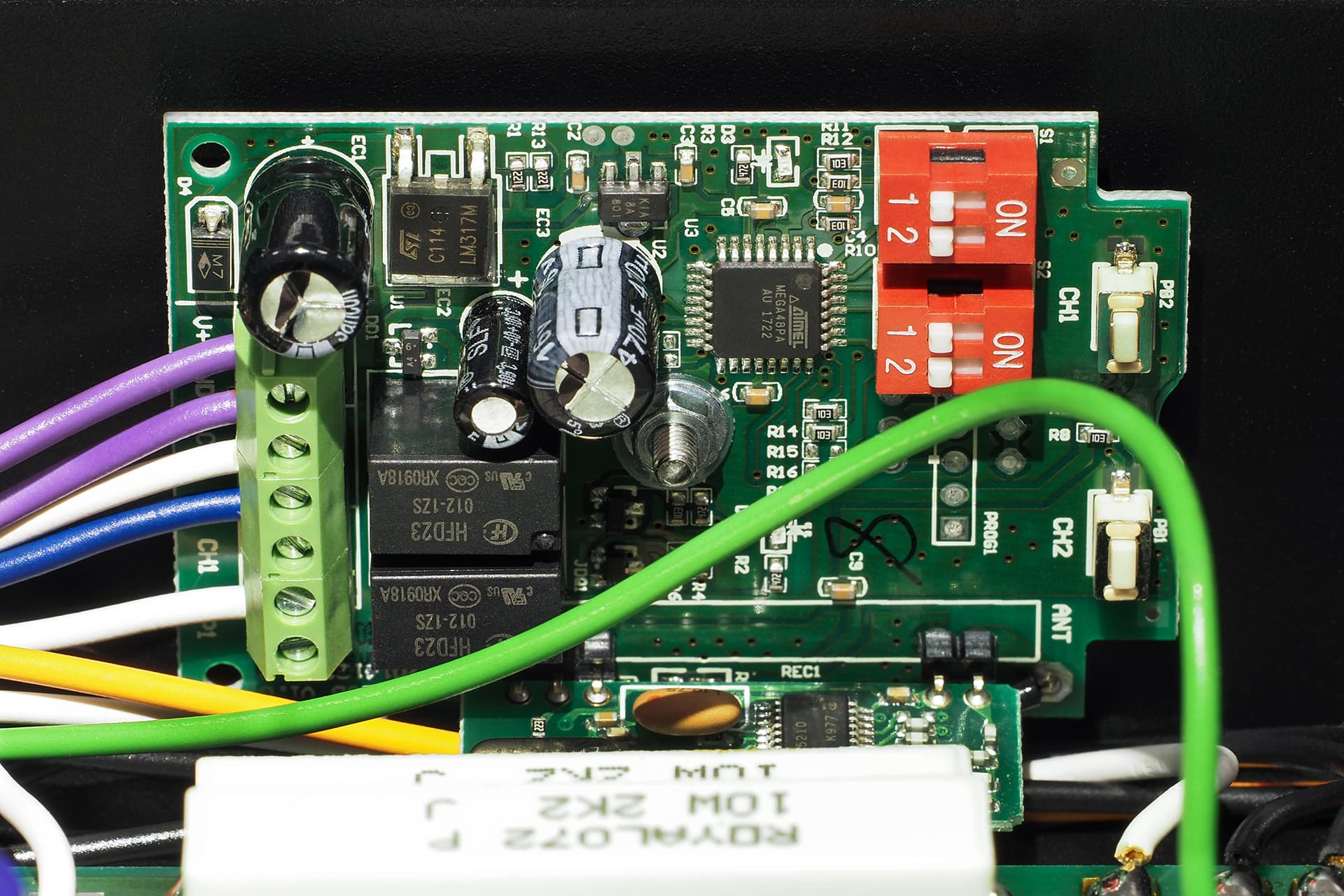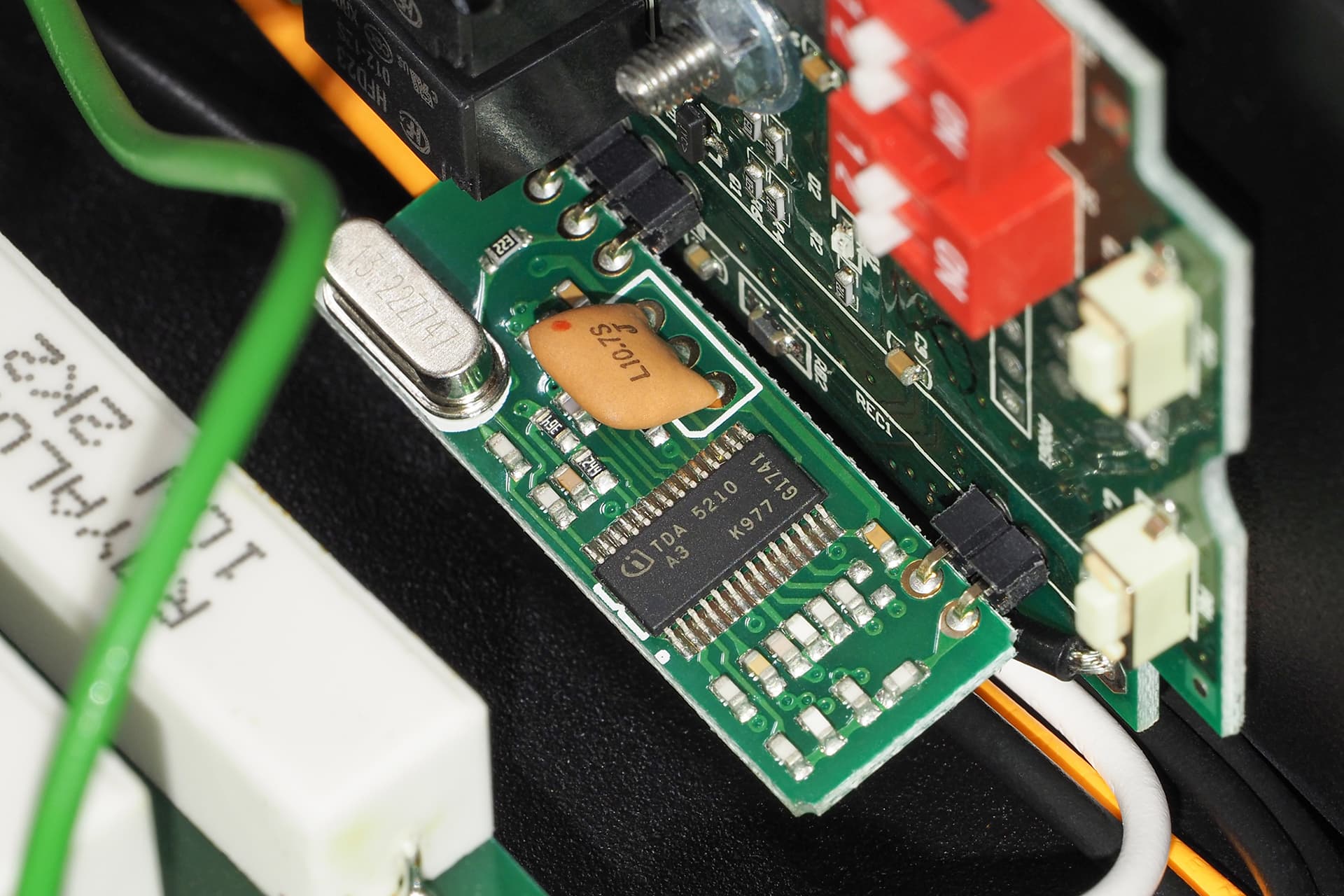 В левом верхнем углу размещен модуль, отвечающий за работу пульта дистанционного управления. В качестве РЧ-приемника выступает микросхема TDA5210, «мозгом» служит микроконтроллер ATmega48PA-AU — тут никаких отличий от уже знакомых нам усилителей Fezz Audio.