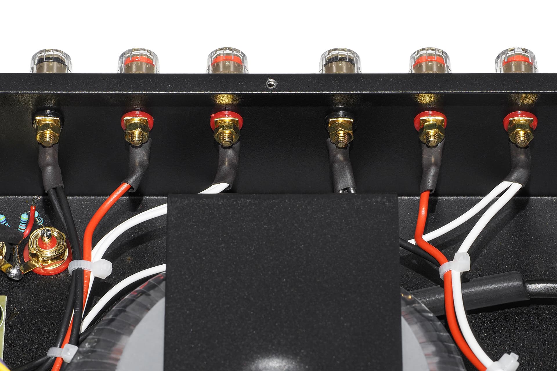 Защитный кожух для ламп легко устанавливается и при необходимости надежно закрепляется винтами, которые можно увидеть на иллюстрации выше — пока кожуха нет, они выполняют декоративную функцию, скрывая предназначенные для них отверстия. С установленным кожухом усилитель выглядит чуть менее впечатляюще, хотя тут дело вкуса. Ну и возможность меньше беспокоиться о сохранности ламп тоже дорогого стоит.
