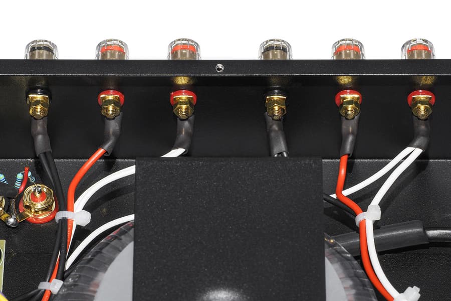 На заднюю стенку выведены разъемы для подключения источников звука и акустических систем. Последние выполнены на резьбовых креплениях и выглядят основательно.