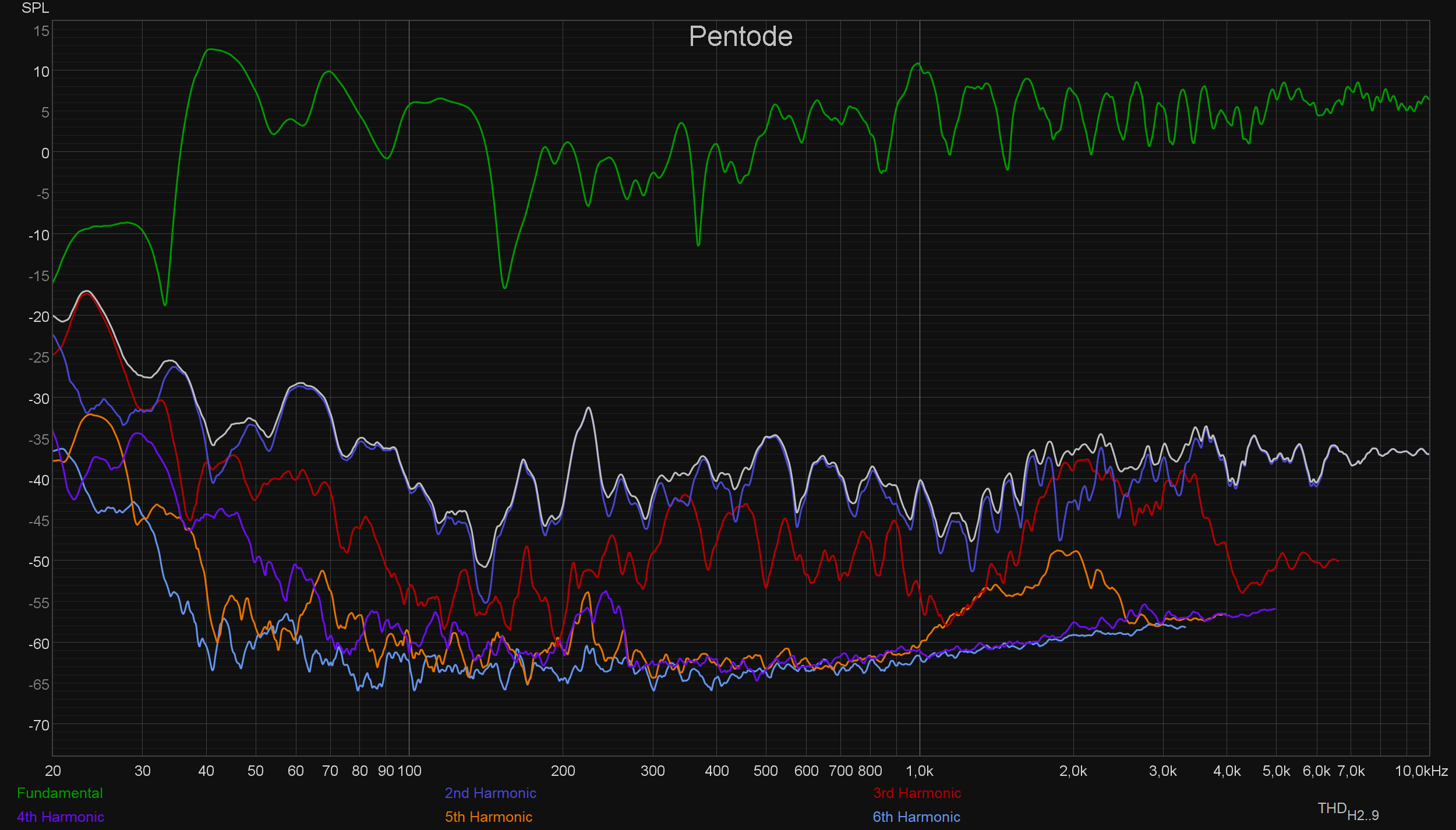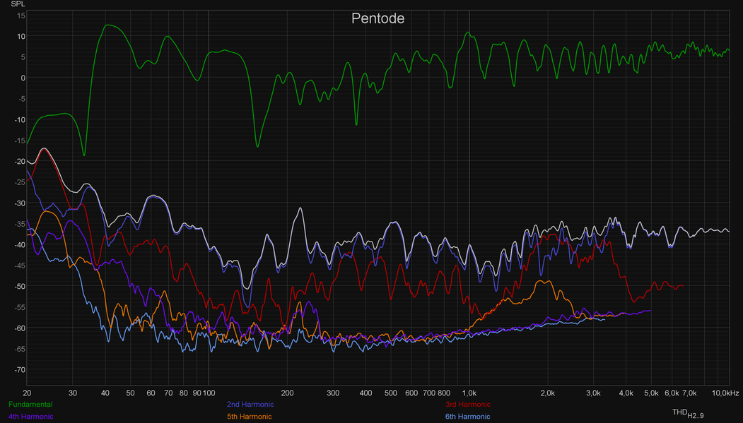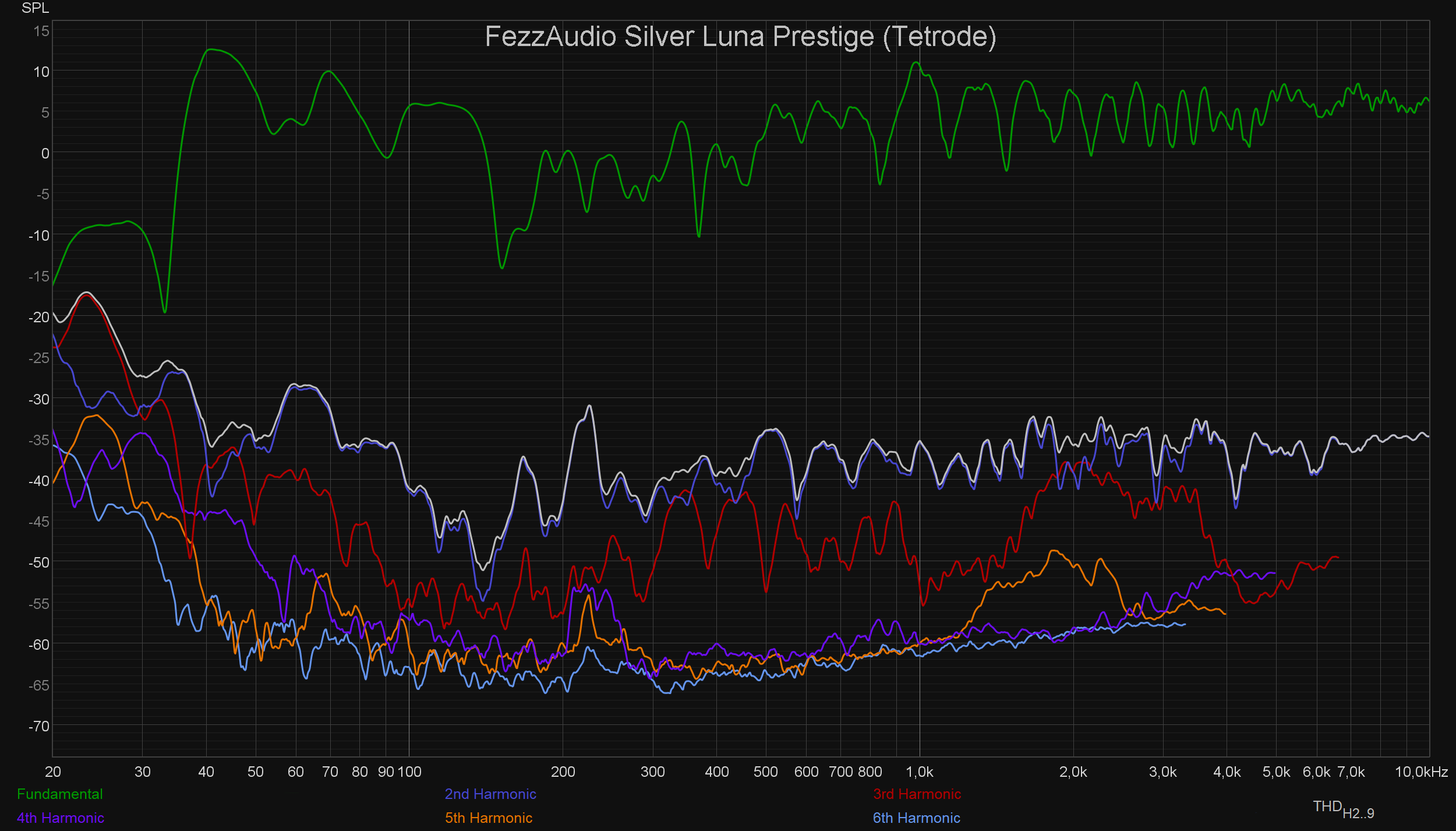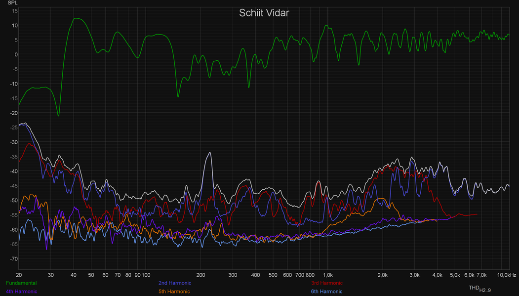 Вот тут разница уже есть, но хорошо заметно, что акустика и комната вносят куда больший вклад в звучание, чем усилитель. И вновь возникает вопрос: почему же звук ламповых усилителей многим людям нравится намного больше? Источников его окраски может быть два — АЧХ и гармонические искажения. С АЧХ разобрались: вряд ли источник «теплого лампового звука» кроется там. Остаются искажения. Заявленный КНИ у тестируемого сегодня Fezz Audio Silver Luna Prestige составляет менее 0,35%, а у Schiit Vidar — уже менее 0,01%, что как бы сразу намекает. Посмотрим на графики искажений при подключении каждого из усилителей.