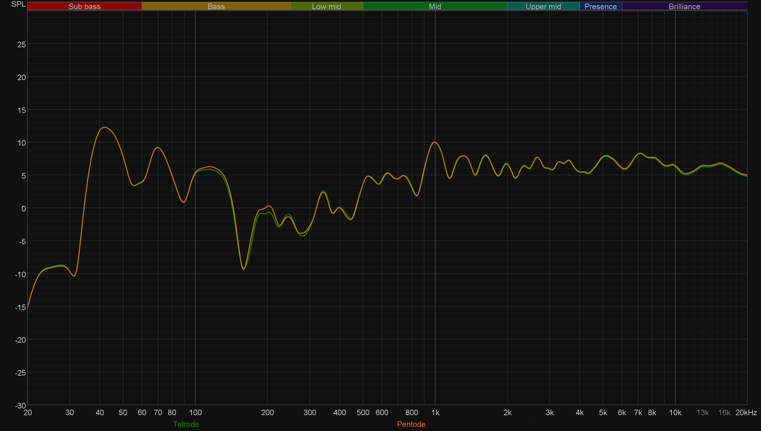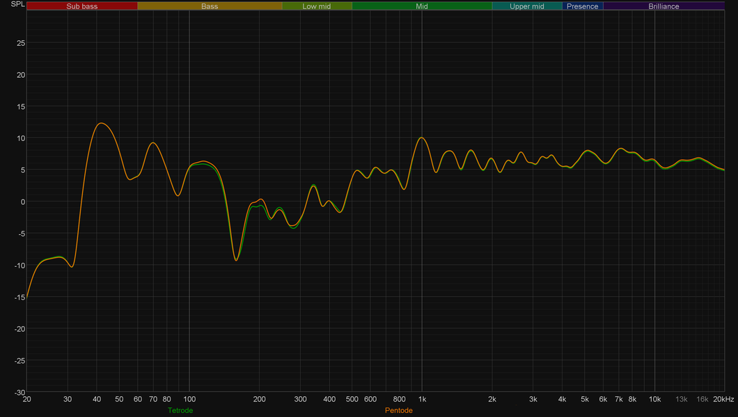 На этом с субъективными впечатлениями покончено. Перейдем к измерениям и графикам. В очередной раз заметим, что прослушивание и замеры проводятся в специально подготовленном помещении — не том, где происходит фотосессия. Во время всей серии измерений микрофон находился примерно в 1,5 метрах от одной из колонок на уровне высокочастотного излучателя. Для начала сравним графики АЧХ в двух режимах — тетрод и пентод.