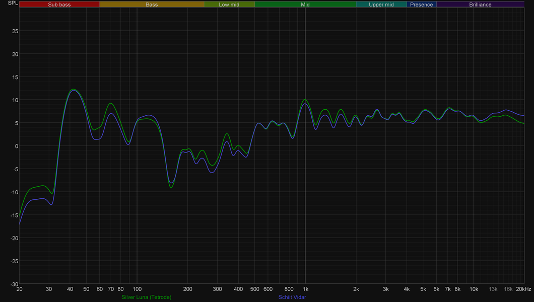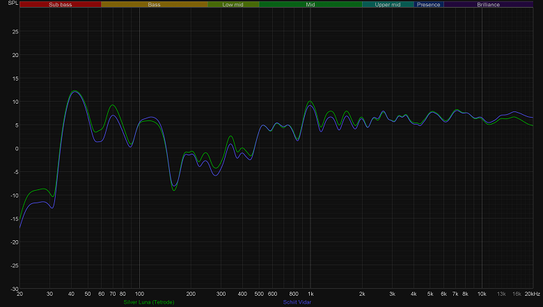 Басы у нас очевидно получились гулковатыми, в точке прослушивания мы добились гораздо лучших результатов. Но сейчас мы смотрим на разницу между режимами. А ее толком и нет. Но в процессе прослушивания регулярно начинает казаться, что есть… Ну и вообще, интересно было бы посмотреть, откуда берется присущая ламповым усилителям окраска, более известная как «теплый ламповый звук». И вот тут мы решили поставить небольшой эксперимент, ради которого в сетапе появился Schiit Vidar — отличный транзисторный усилитель. Переключаемся на него — снова получаем график АЧХ, снова сравниваем.
