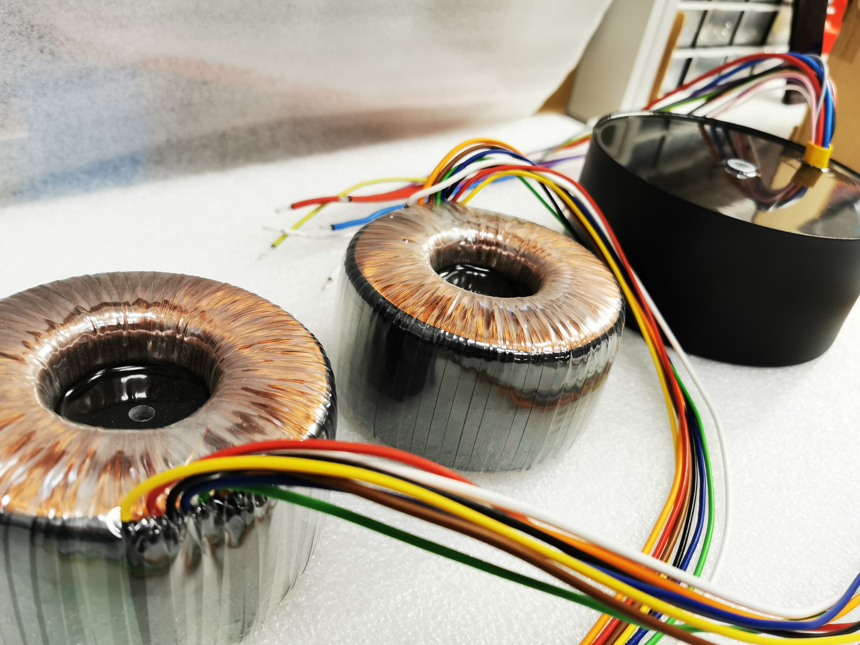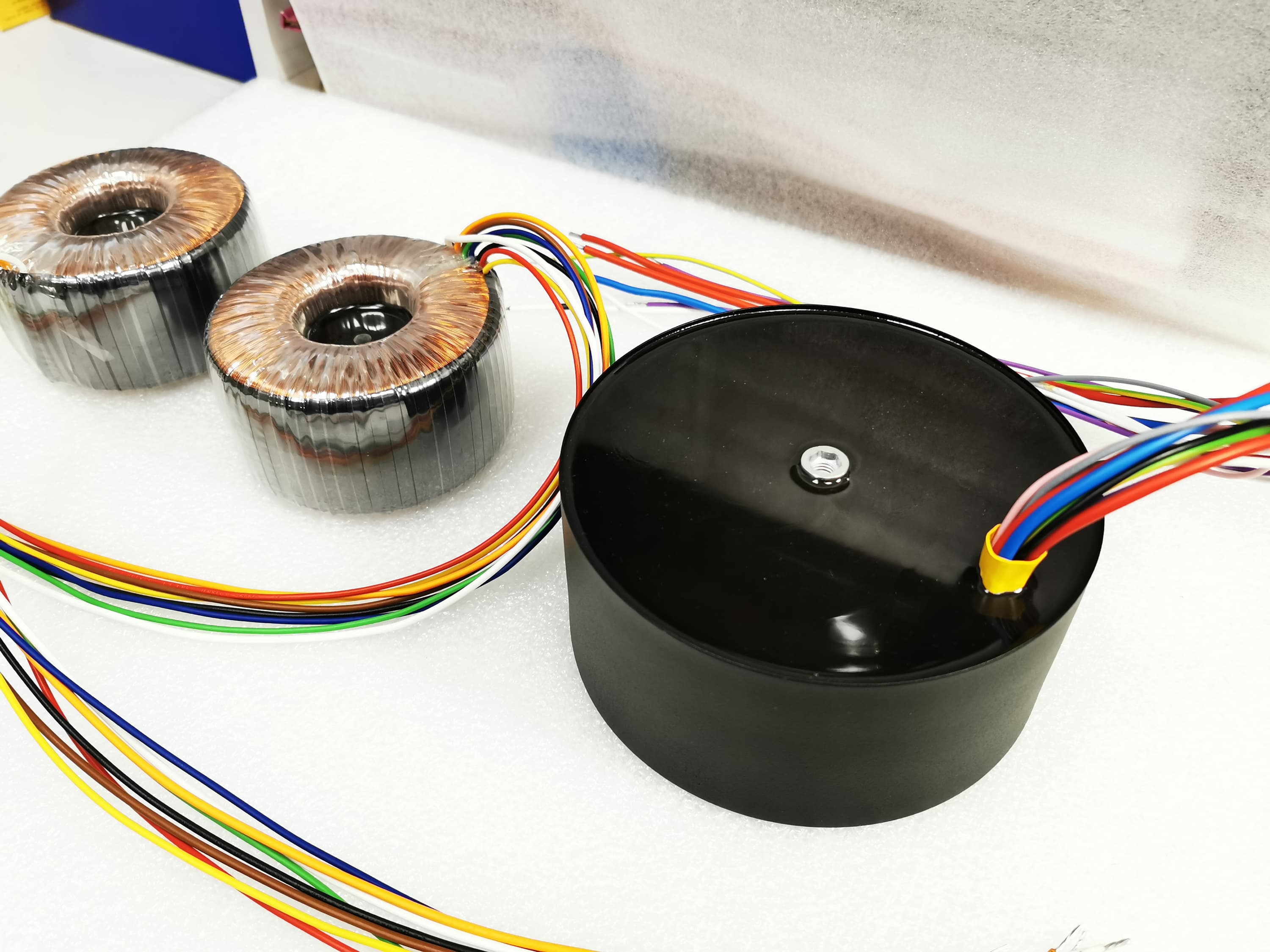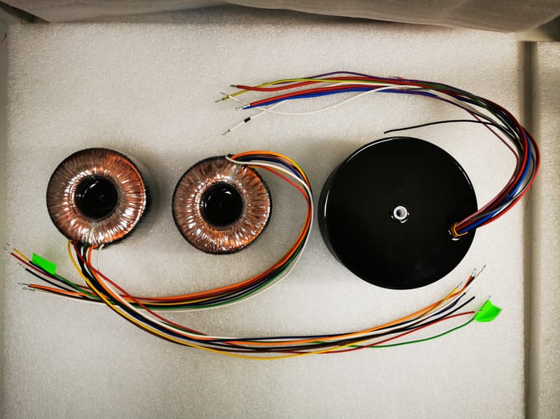 В «полевых условиях» студии нам не удалось снять кожухи с трансформаторов — закреплены они на совесть, да еще и имеют общие крепежи с другими компонентами. Потому мы обратились к производителю с просьбой поделиться фото тороидальных трансформаторов, использующихся в Fezz Audio Titania — они на фото ниже: два выходных (KT88 push-pull output transformer) и один побольше для питания (Supreme Audio Grade power transformer).