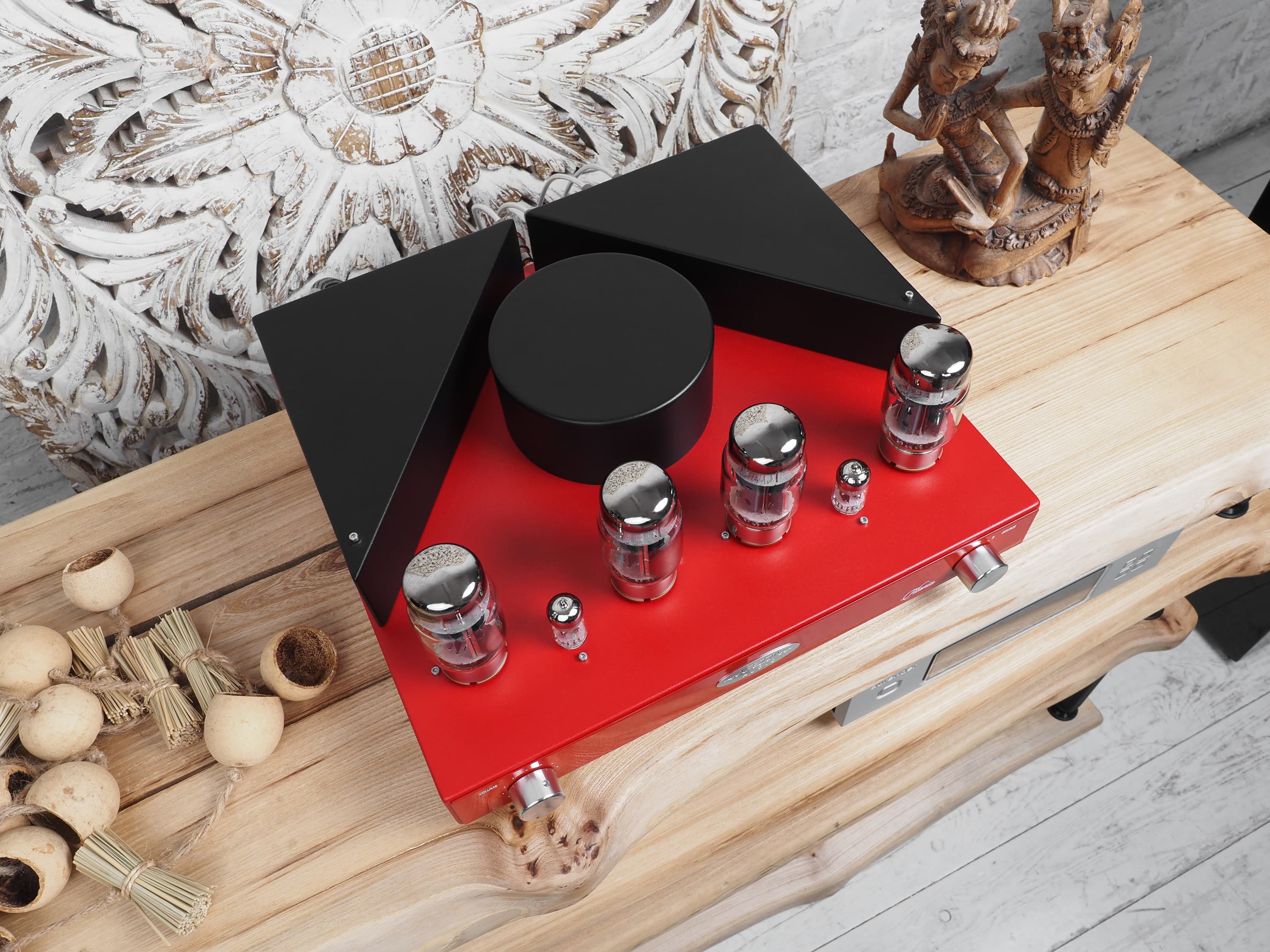 В комплекте Fezz Audio Titania идет кожух для ламп, предусмотрены возможность регулировки громкости с помощью радиопульта и вход Home Theatre для интеграции с домашним кинотеатром. Ну и, конечно, выглядит устройство крайне привлекательно — для ламповых усилителей это тоже важно.