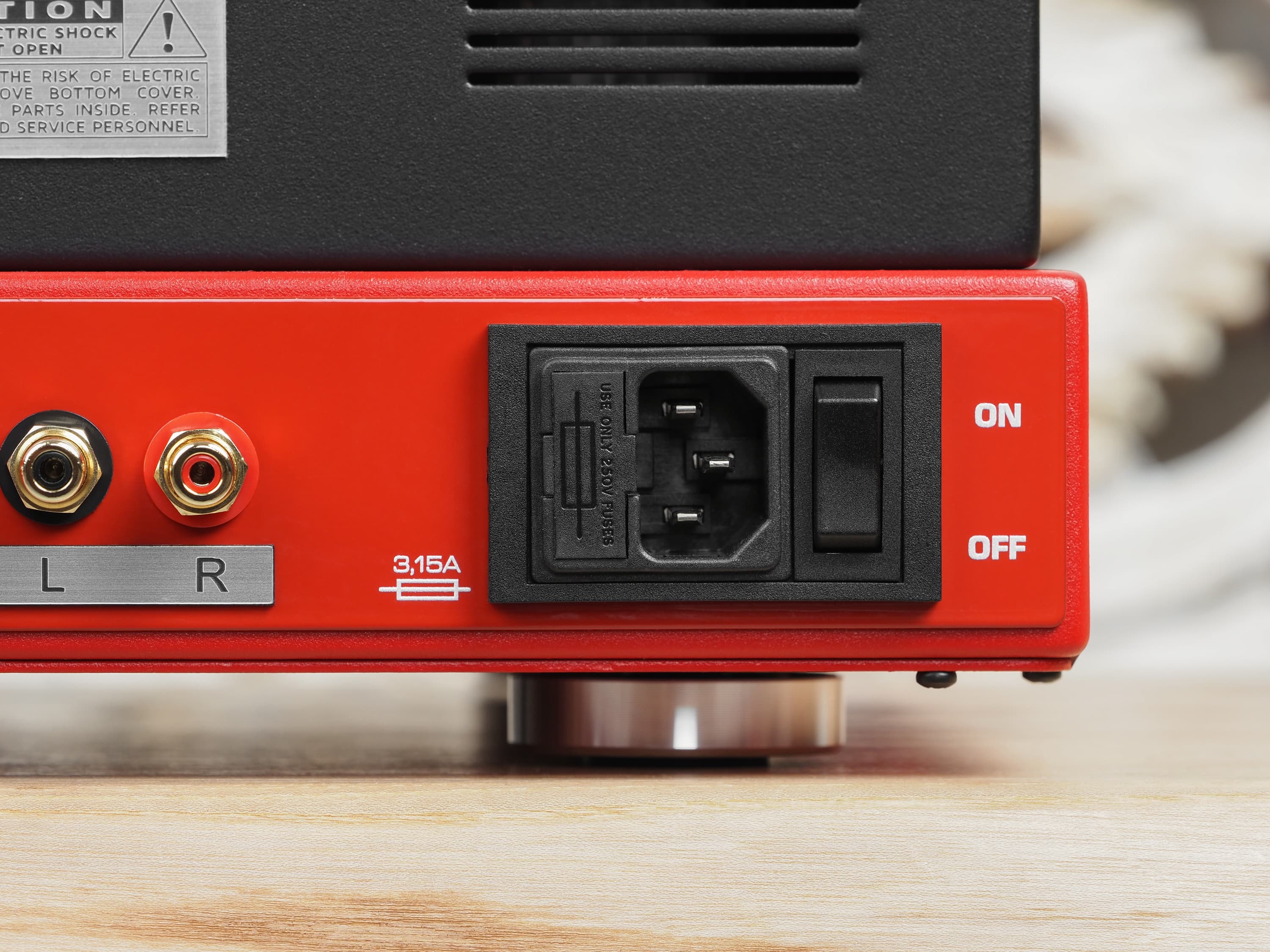 Далее подключаем кабель питания, ну а включим Fezz Audio Titania с помощью расположенной рядом клавиши мы уже после окончания подготовительных работ. Размещать его, кстати, стоит на верхней полке стойки, где лампам будет обеспечен хороший уровень вентиляции — не нужно забывать, что при работе они основательно нагреваются.