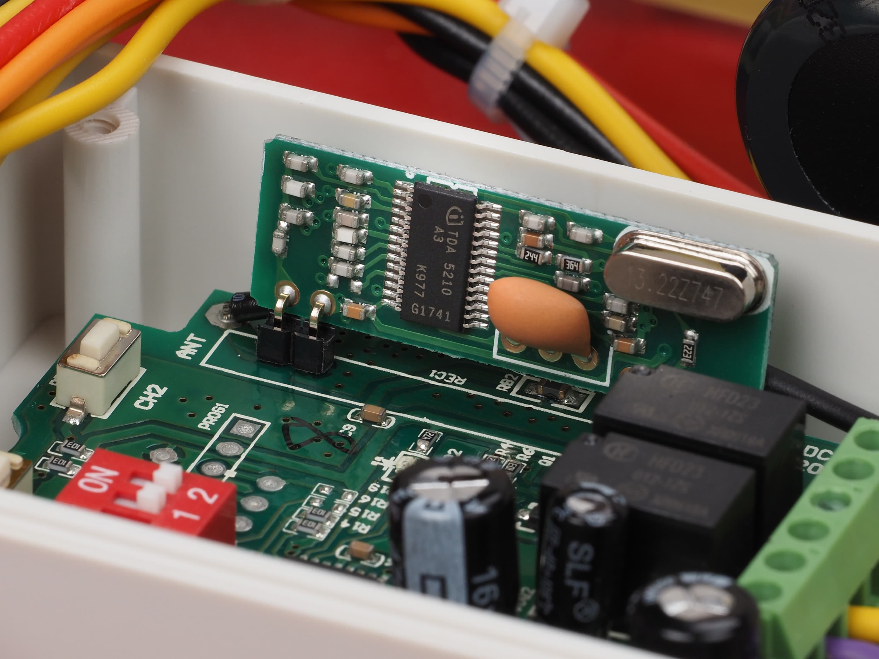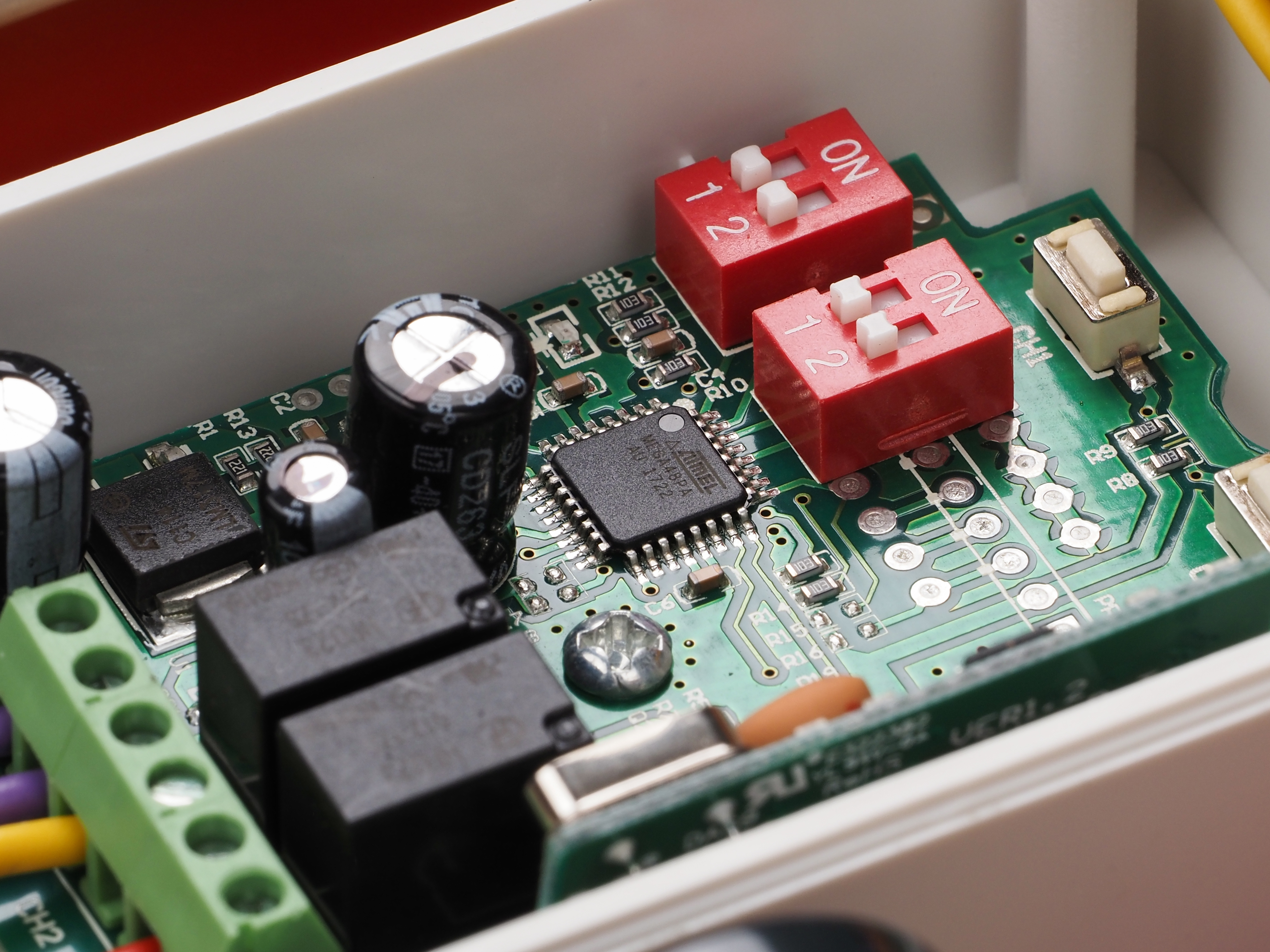 Почти по центру виден модуль, отвечающий за работу пульта дистанционного управления. В качестве РЧ-приемника выступает микросхема TDA5210, «мозгом» служит микроконтроллер ATmega48PA-AU.