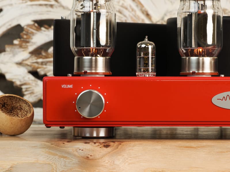 Усилитель поставляется в четырех цветовых вариациях: bleach (белая), big calm (бордовая), black ice (черная), burning red (красная). Мы для тестирования выбрали последнюю из перечисленных и самую эффектную. Выглядит Fezz Audio Titania отлично: основательно, с нотками винтажности — как и положено ламповому усилителю. От одного внешнего вида уже душа радуется — еще до включения питания. К качеству сборки, естественно, никаких вопросов — ничего не скрипит и не люфтит, солидный металлический корпус внушает уважение. На передней панели размещены две ручки — для управления громкостью и переключения входов.