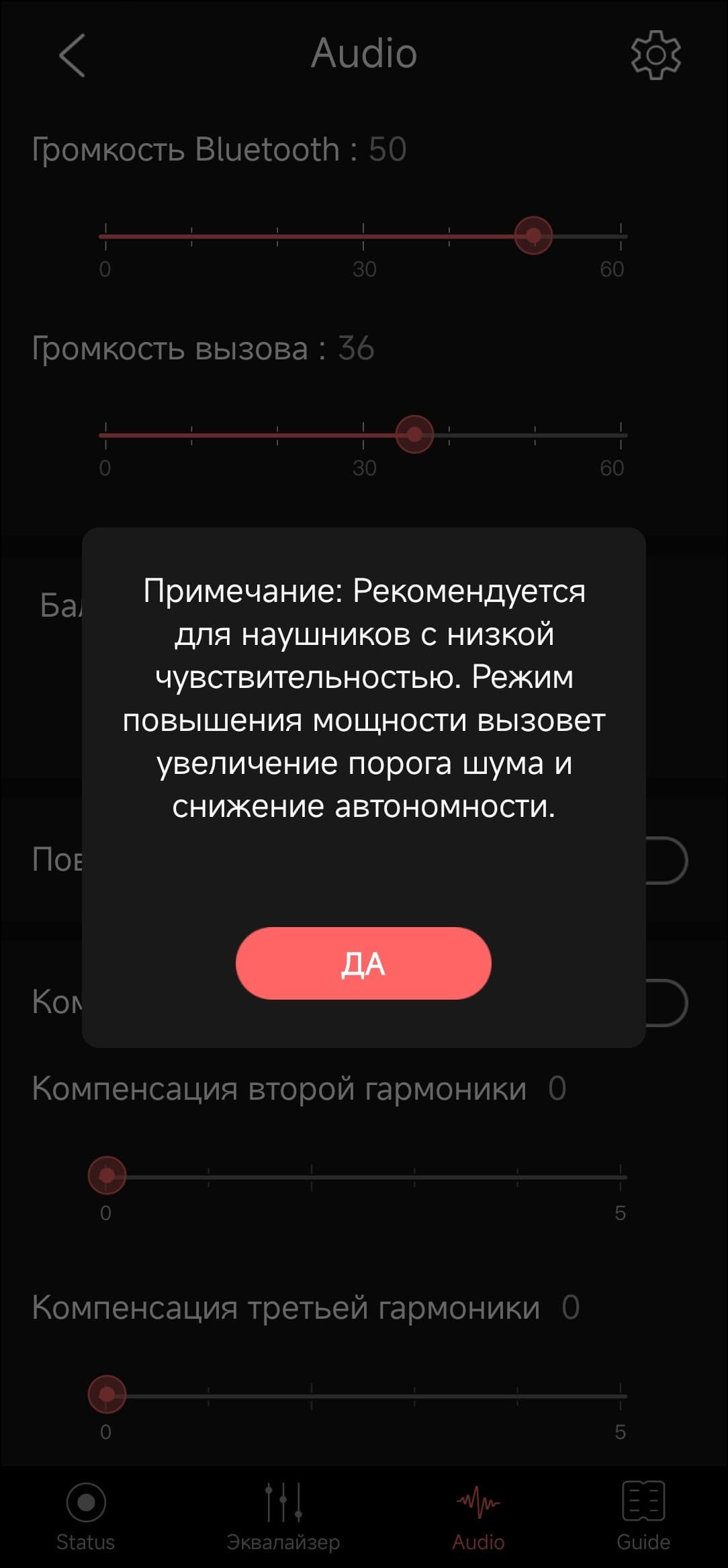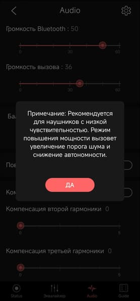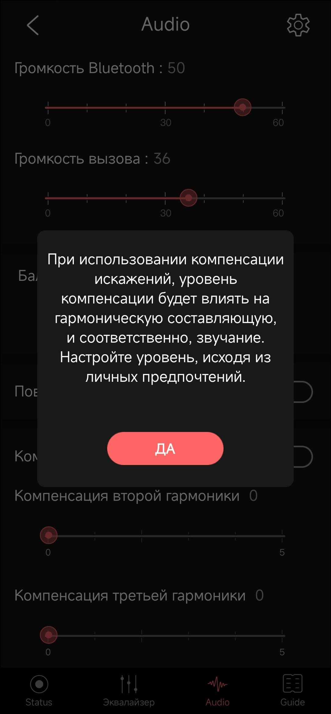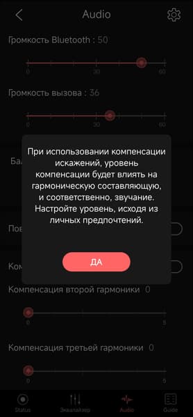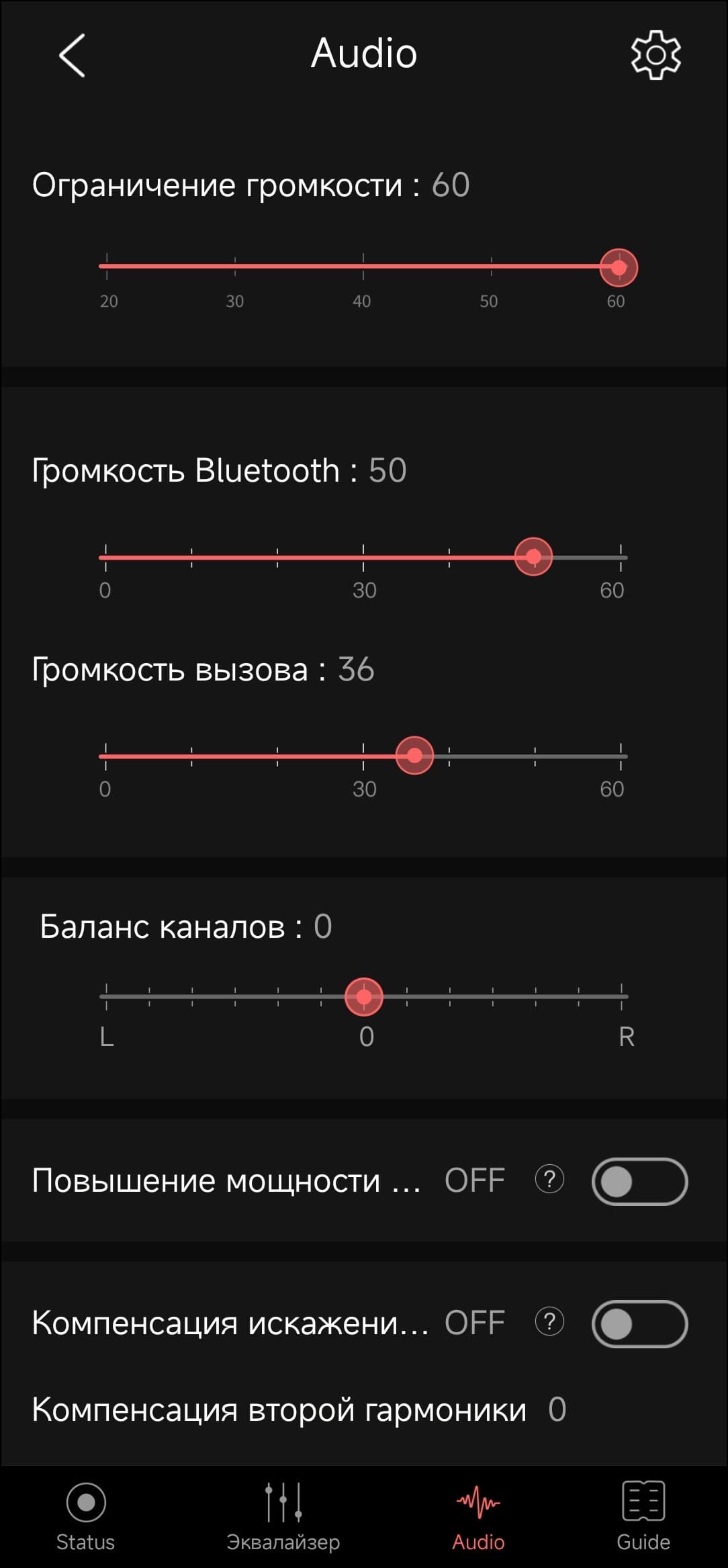 Также есть возможность выбрать предельный уровень громкости, повысить мощность, посмотреть инструкцию на английском, а еще — активировать функцию компенсации искажений, о котрой мы еще поговорим ниже.