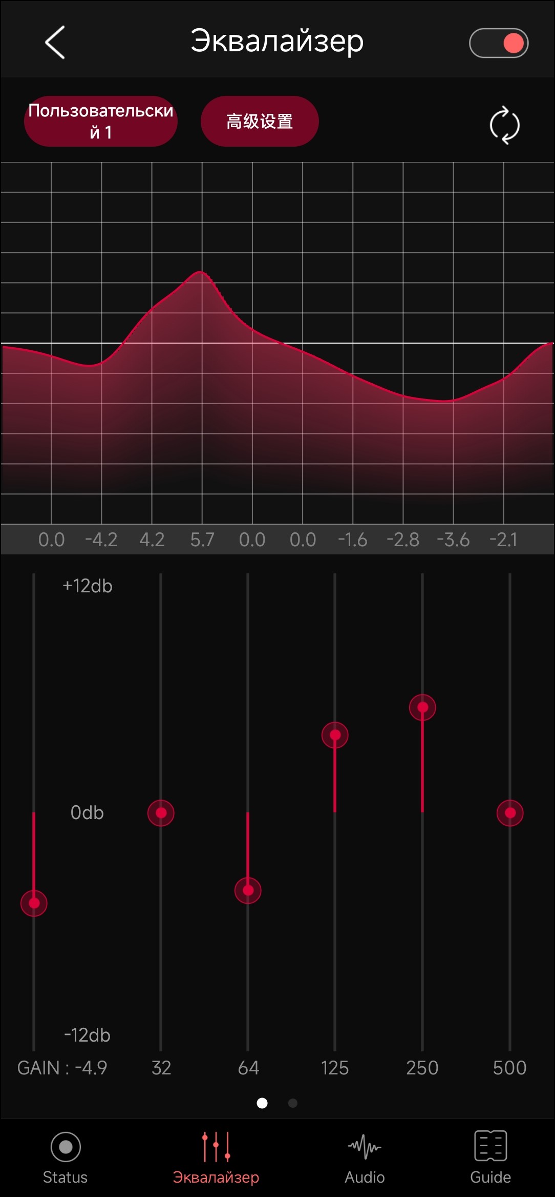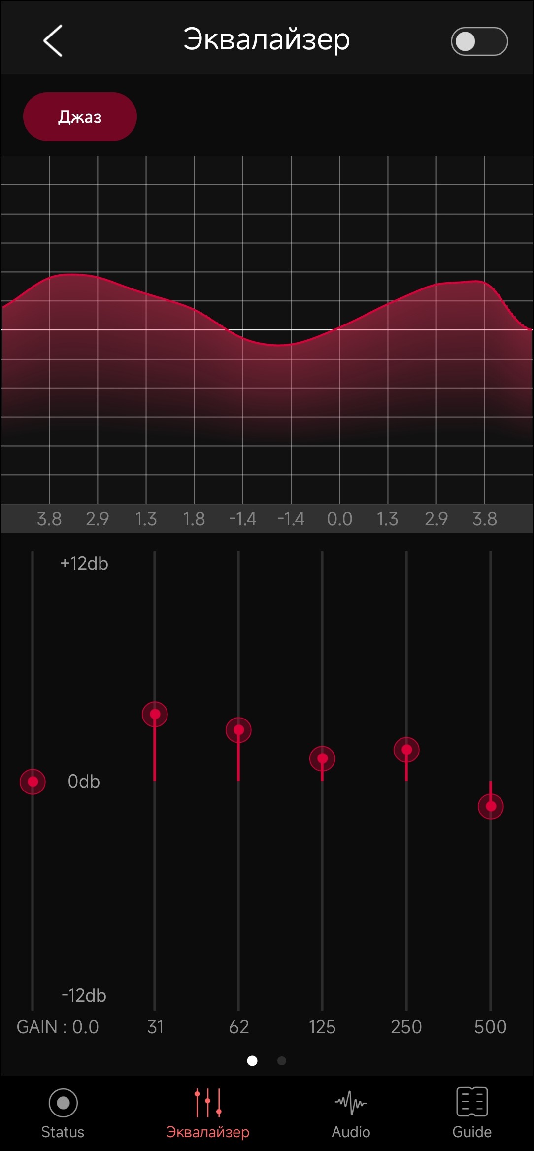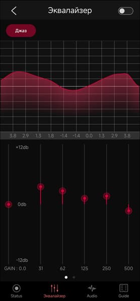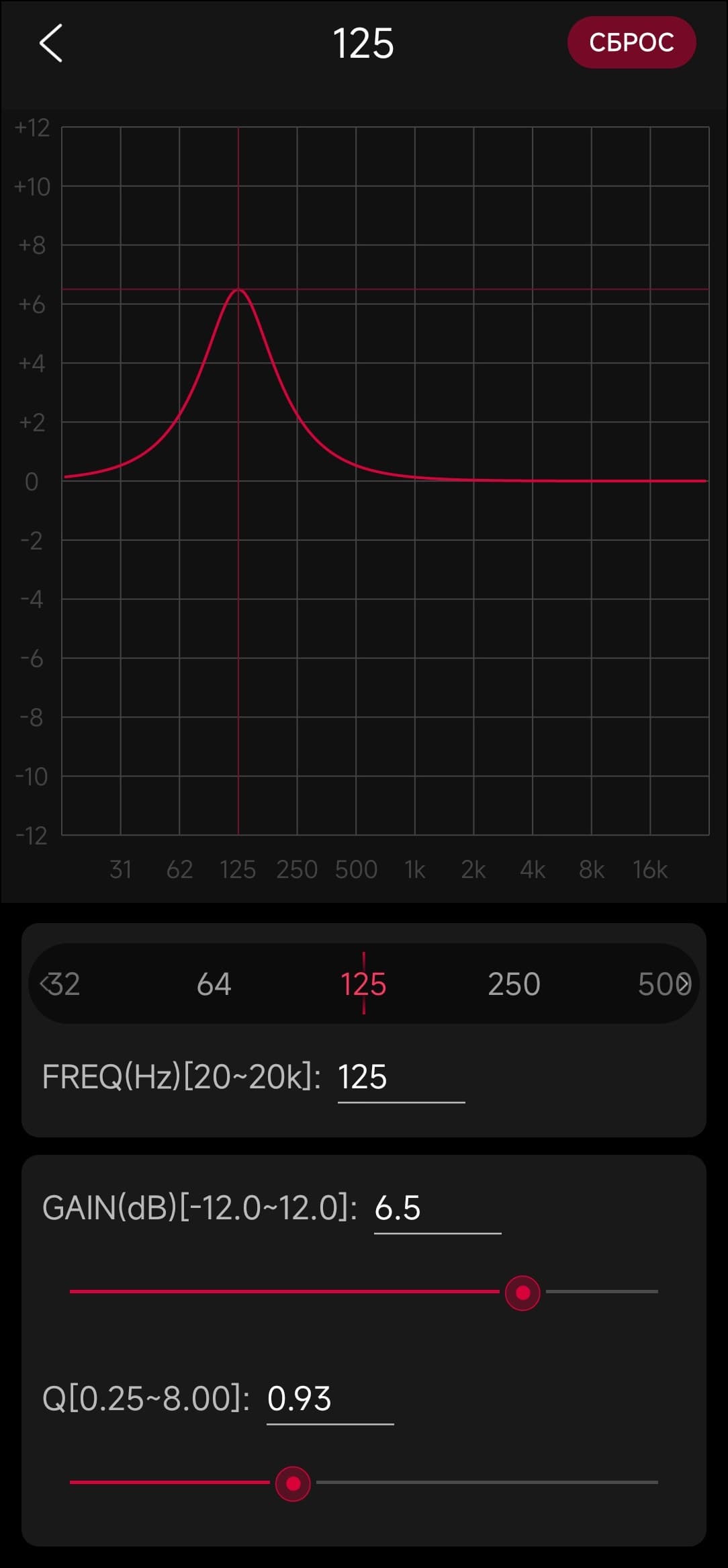 В приложение встроен мощный эквалайзер. Несколько пресетов, десять полос, возможность регулировать частоту и добротность — есть все необходимое для полноценной коррекции звучания под свой вкус и используемые наушники.