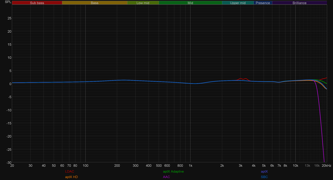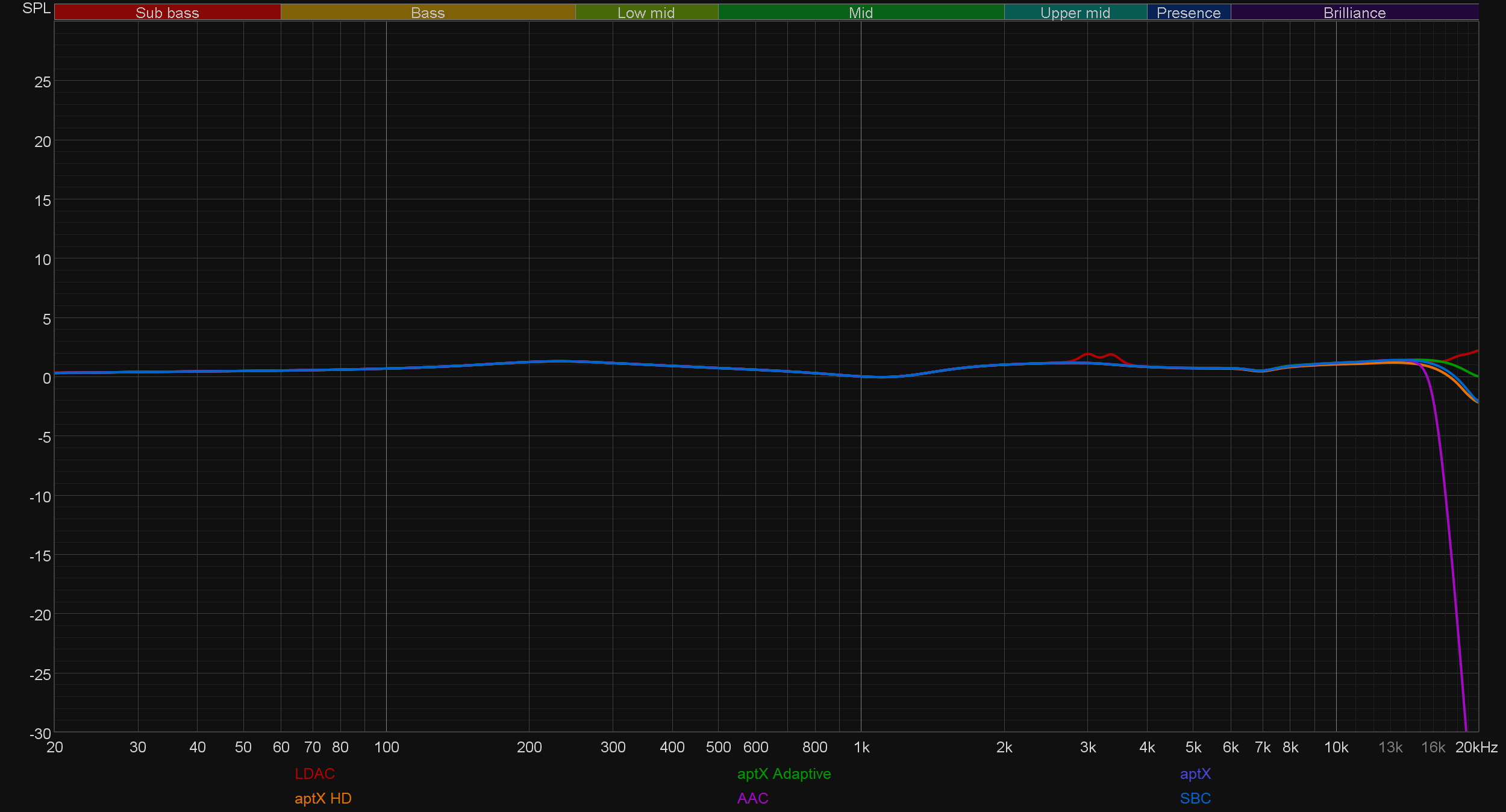Посмотрим на график АЧХ при подключении посредством Bluetooth. Он далеко не такой «ровный», как при проводном — видимо, таким образом устройство компенсирует особенности подключения и работы используемых кодеков. Делает она это очень деликатно, субъективно звучание остается сбалансированным и приятным.
