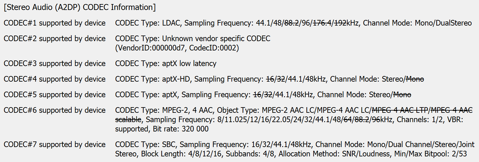 | Поддерживаемые кодеки | AAC, aptX, aptX adaptive, aptX HD, aptX Low Latency, LDAC, SBC |