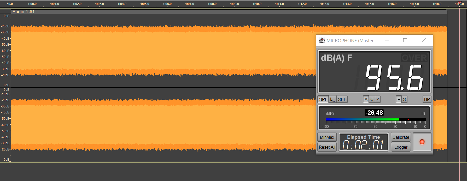Безопасным уровнем звукового давления при прослушивании музыки считается 75 дБ, но на практике большинство слушателей предпочитает уровень 90-100 дБ. Мы транслируем в наушники белый шум, фиксируя уровень SPL в районе 95 дБ, сразу после старта воспроизведения запускаем запись сигнала с измерительного стенда.