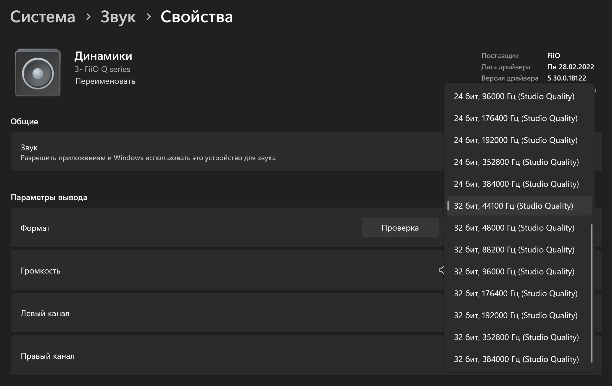 После подключения к ПК под управлением Windows 11 ЦАП/усилитель сразу определяется системой, максимальный доступный уровень разрешения — 32 бит и 384 кГц, всё как заявлено.