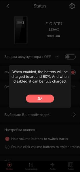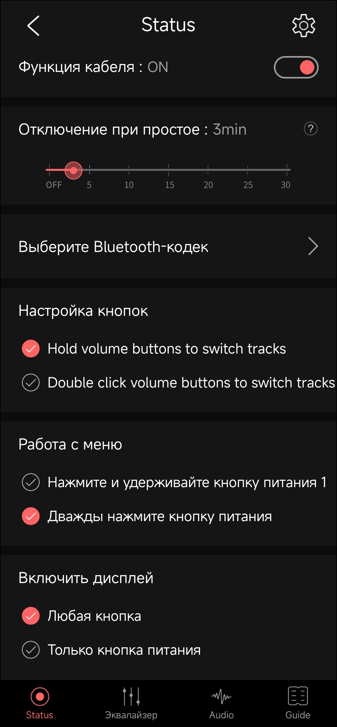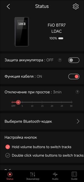 На главном экране виден уровень зарядки, там же можно включить «защиту аккумулятора» — при активации этой функции он будет заряжаться только на 80%. Там же можно выбрать время простоя, после которого устройство будет отключаться. Если какой-то кодек использовать нет желания — его можно деактивировать. Например, нам хотелось немного потестировать «цапоусилитель» с LDAC, а по умолчанию используется aptX Adaptive — его-то мы временно и отключили. Также можно настроить кнопки для работы с меню, переключения треков и активации дисплея.