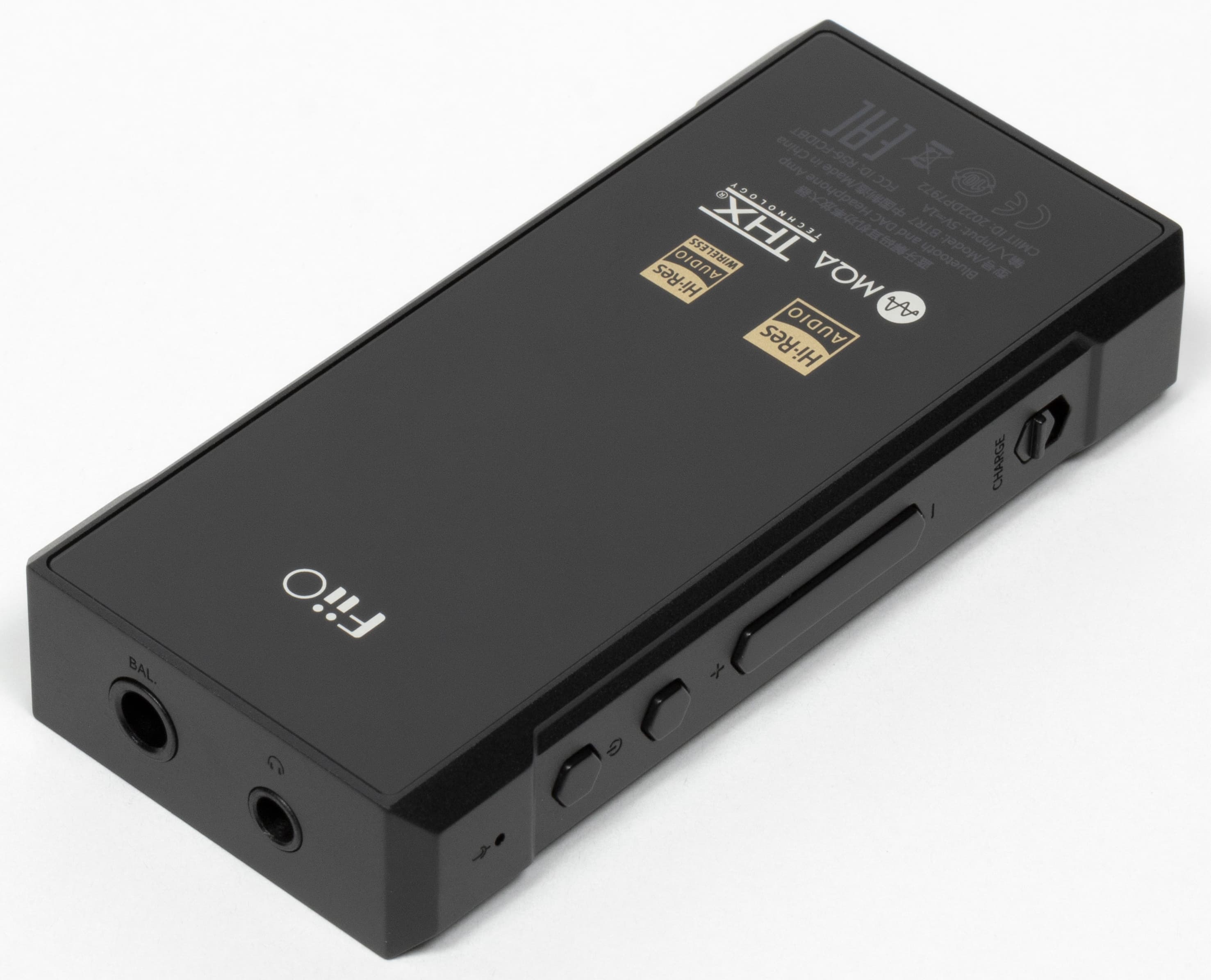 Размеры, как уже упоминалось выше, у FiiO BTR7 довольно солидные — 40×15×84 мм. Благодаря анодированному цельнометаллическому корпусу и крупному экрану устройство напоминает, скорее, небольшой плеер, чем привычный «цапоусилитель». На левом боку расположились кнопки управления и отверстие микрофона, на верхней грани — два разъема для подключения.
