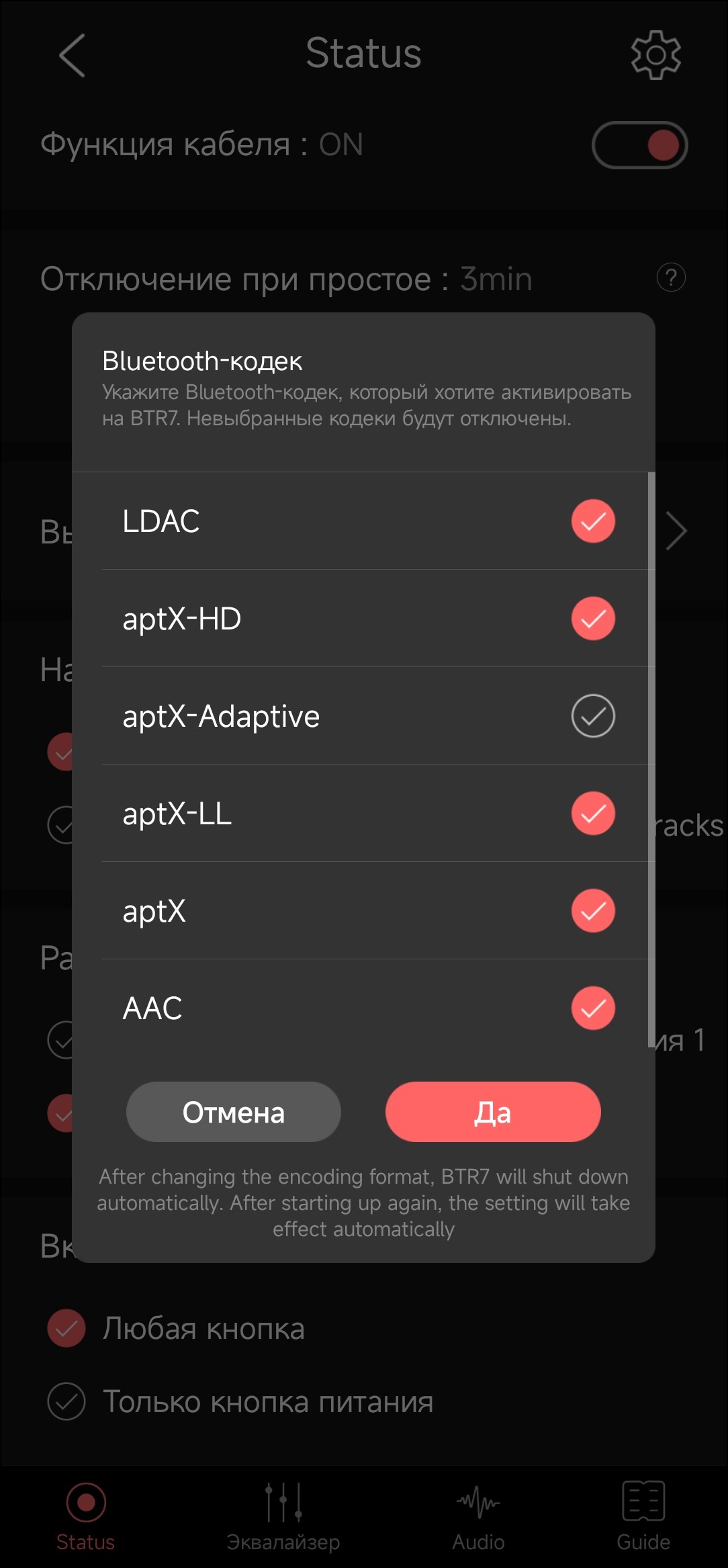 Беспроводное подключение осуществляется стандартным образом: после включения Bluetooth FiiO BTR7 некоторое время ищет «знакомые» источники звука, далее активирует режим сопряжения. Остается найти его в соответствующем меню гаджета и подключить. Список кодеков и их режимов мы традиционно получили с помощью утилиты Bluetooth Tweaker.