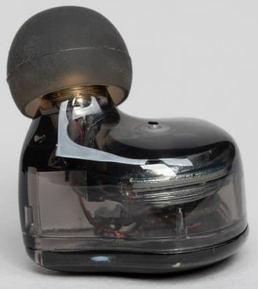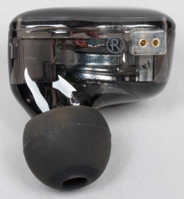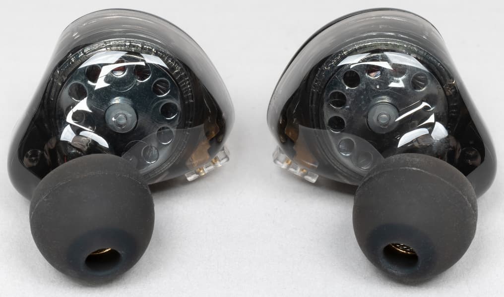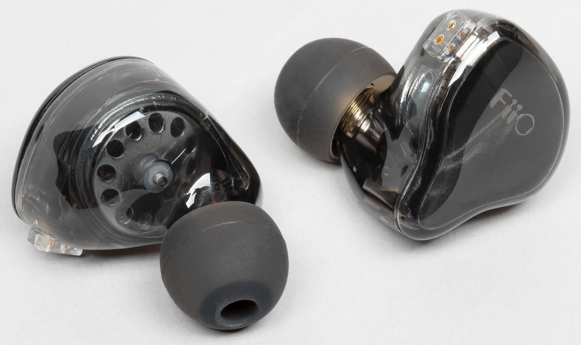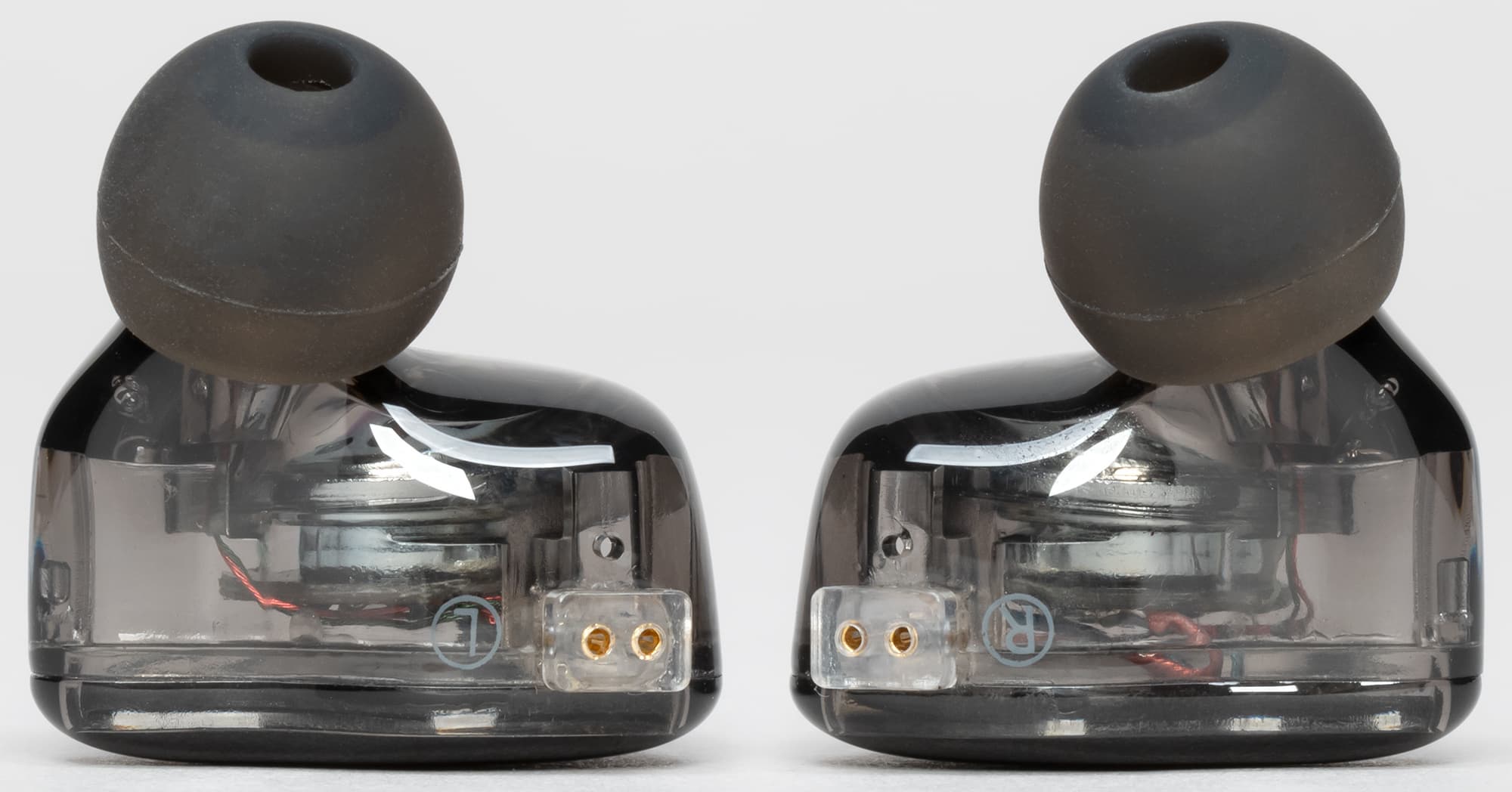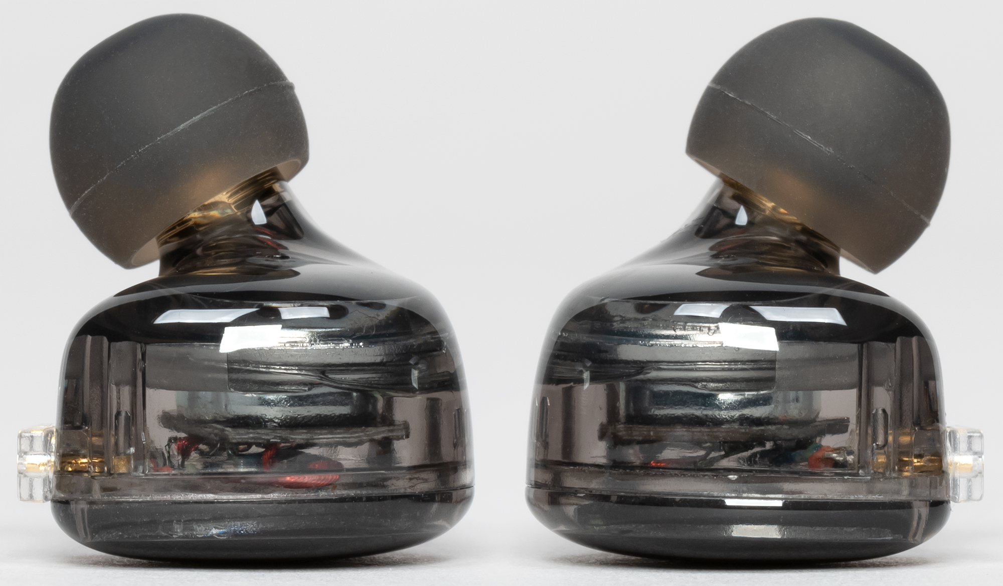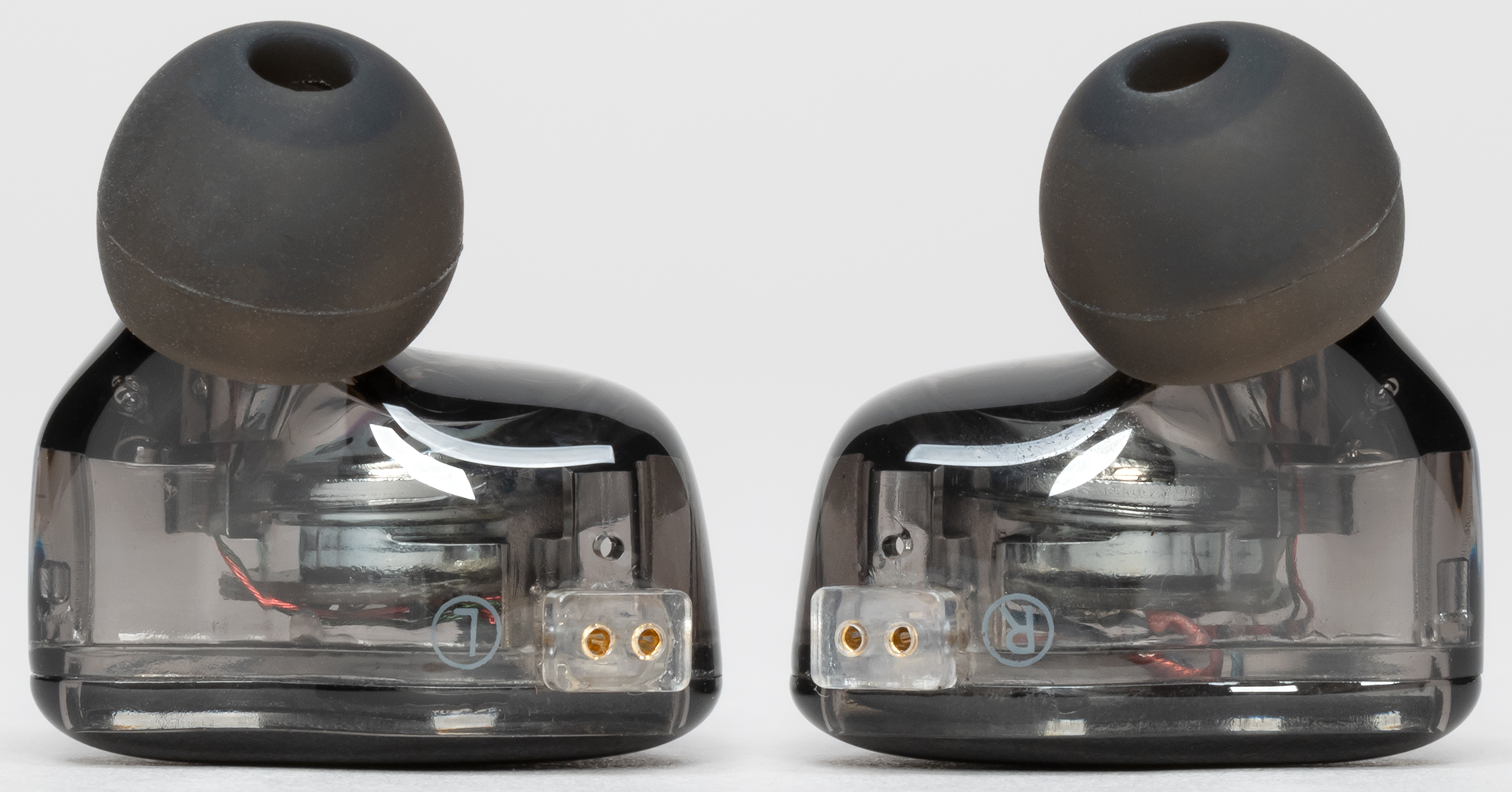 Сквозь боковые грани можно увидеть практически всю «начинку» FiiO FH1s. В нижней части расположены разъемы для подключения кабеля, возле которых нанесена маркировка «право»/«лево».