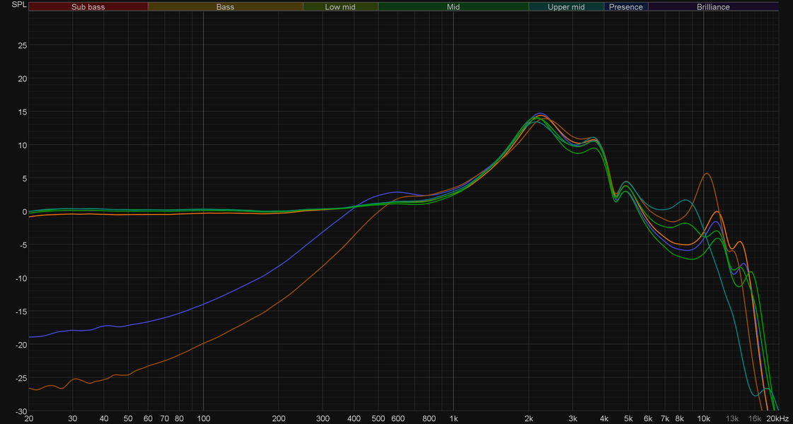 В очередной раз заметим, что на передачу низкочастотного диапазона крайне большое внимание оказывает подбор амбушюров. В качестве иллюстрации приведем графики, полученные с использованием различных пар амбушюров. Сознательно не будем уточнять, какие графики соответствуют каким парам — у каждого конкретного слушателя результат может быть свой. Нашему тестовому стенду явно «не подошли» два варианта, которые мы исключили из общей серии замеров. Остальные результаты были усреднены для получения графика АЧХ, представленного выше.
