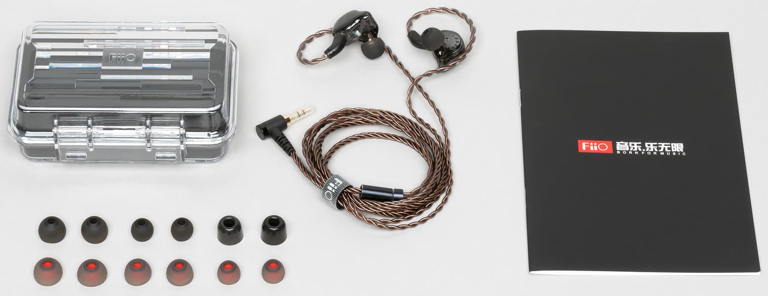 В комплект входят кейс для хранения и переноски, сами наушники с подключенным к ним кабелем, документация и набор амбушюров. С FH1 поставлялись балансный кабель с микроджеком 2,5 мм, а также кабель с микрофоном и коннектором миниджек 3,5 мм. По первому в данном случае можно особенно не скучать: все-таки гарнитура сравнительно бюджетная, балансное подключение для нее — не самая обязательная опция. А вот отсутствие микрофона на комплектном кабеле немного расстраивает.