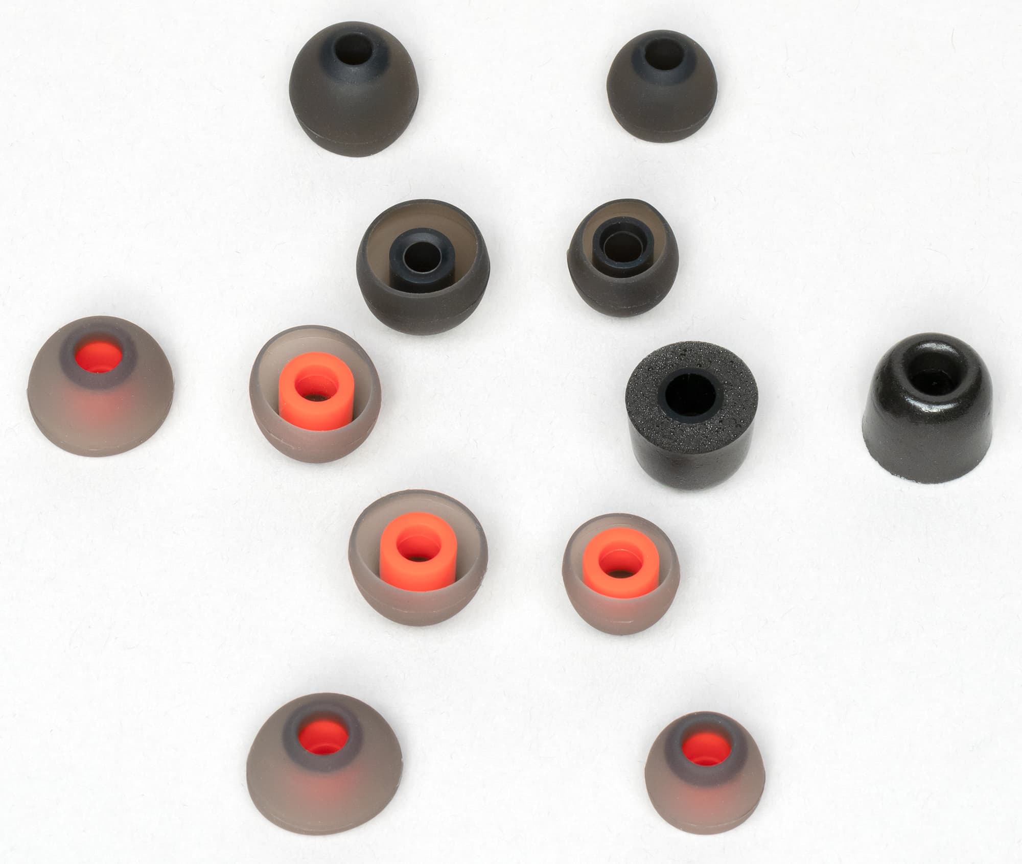 Амбушюры в комплекте трех видов: одна пара пенных, плюс по три пары силиконовых с отверстием побольше и поменьше, производитель называет их bass и balanced — для улучшения передачи НЧ и сбалансированного звучания соответственно.