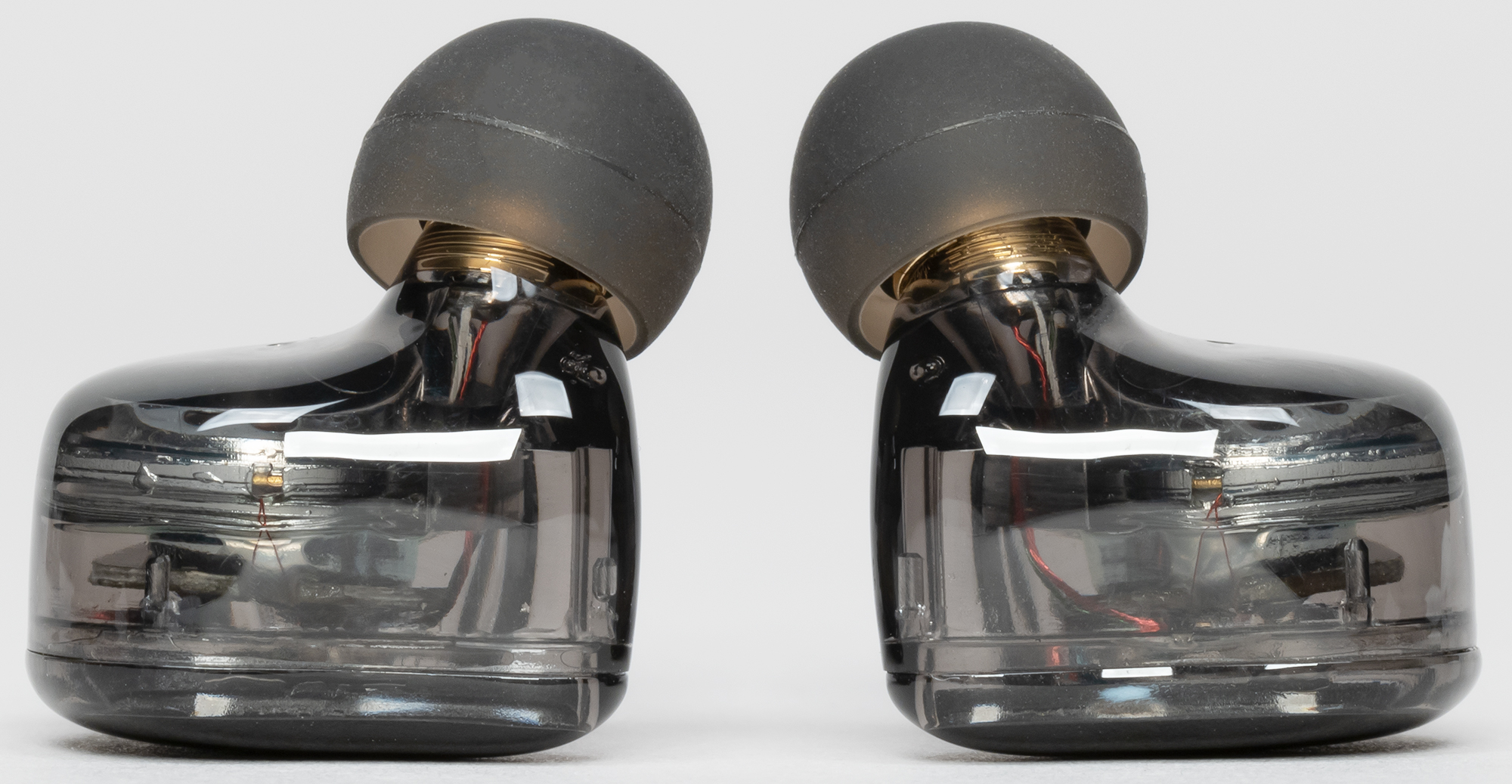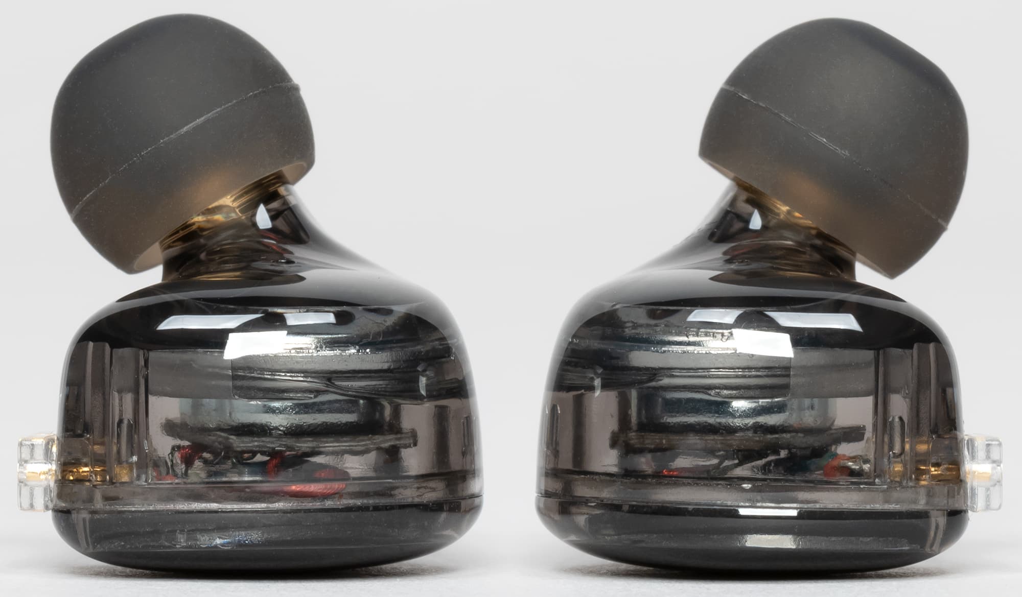 Через прозрачную внутреннюю стенку хорошо видны 13,6-миллиметровые динамические драйверы. Со внешней стороны корпус менее прозрачный благодаря перламутровой покраске с разводами. В реальности она не так заметна, как на фото, но все равно придает наушниками долю оригинальности.