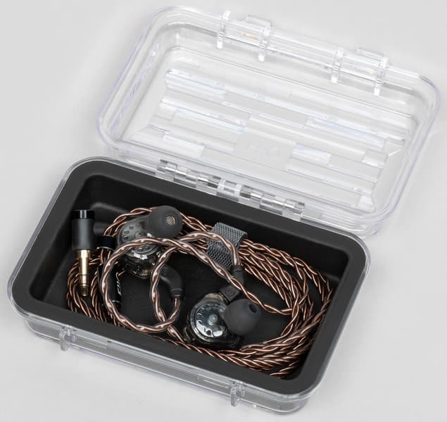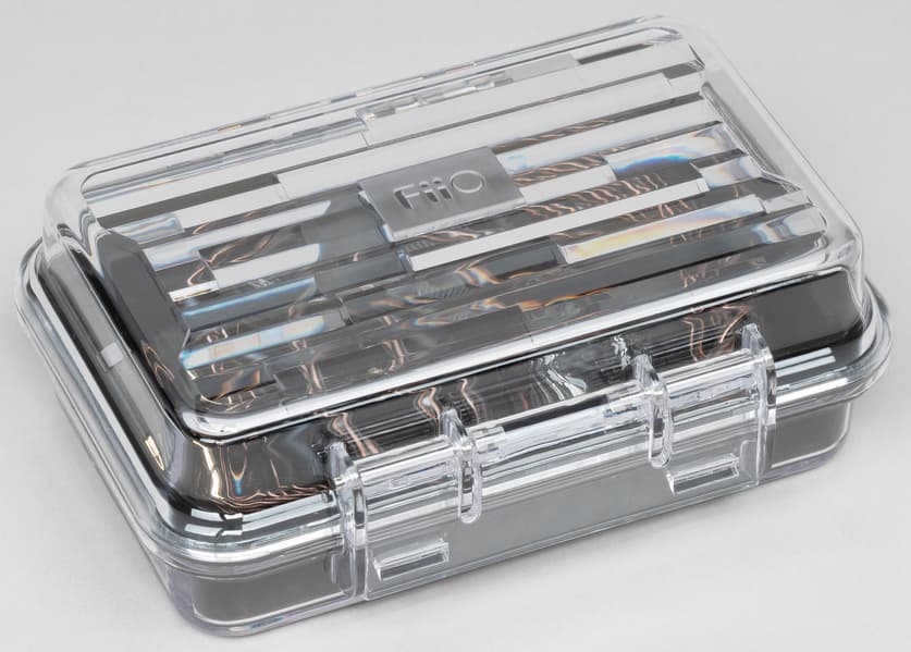 Кейс выполнен из прозрачного пластика и имеет весьма солидные размеры — в кармане не поносишь, что немного странно. Наушники легко уместились бы и в более компактное решение. Зато вместе с ними в кейсе можно носить небольшой внешний ЦАП, например.