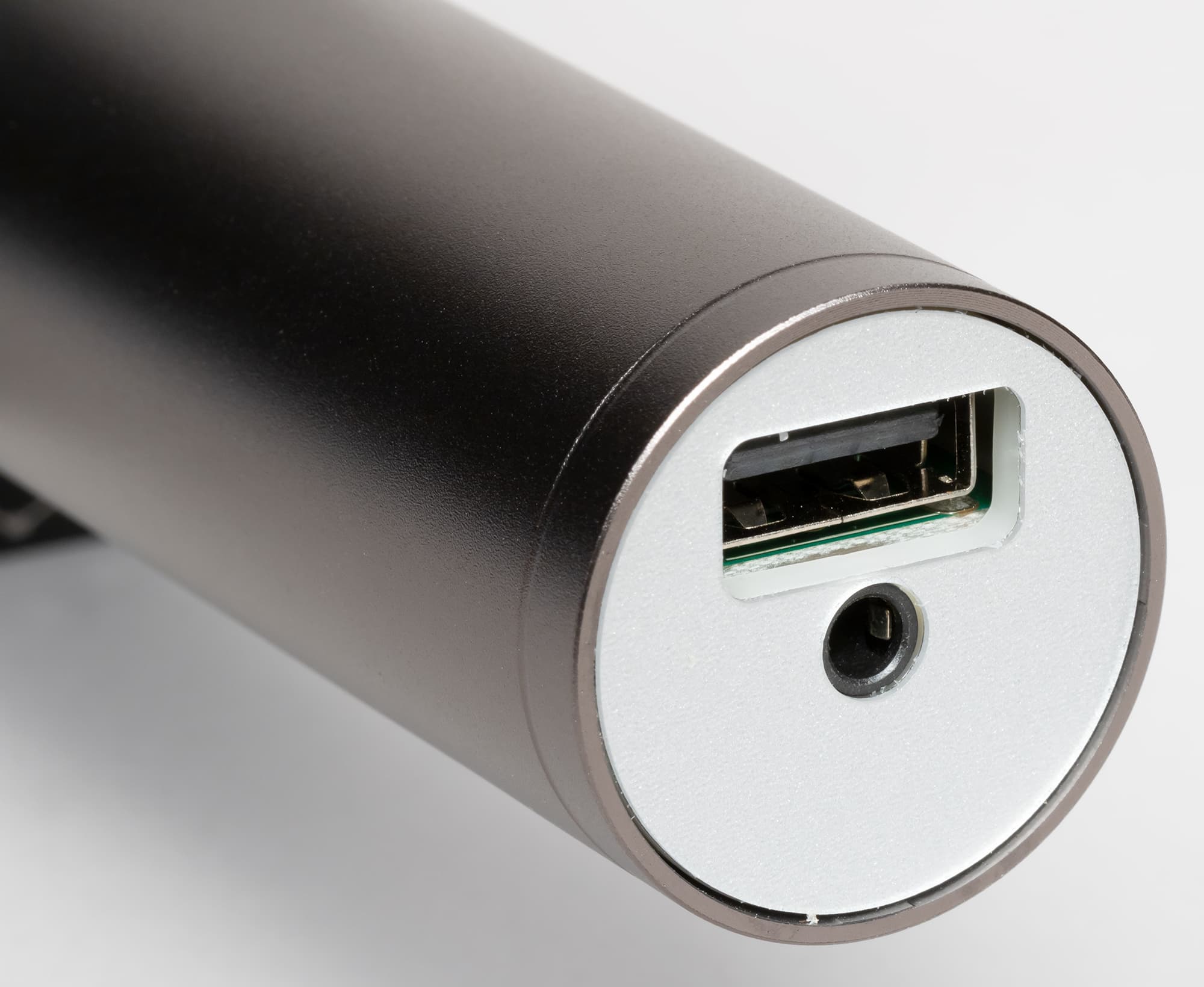 Микрофон закрыт металлической сеткой, на средней части сверху находятся светодиоды, демонстрирующие режим работы FM-передатчика, о котором мы еще поговорим чуть ниже. Торцевая часть ручки закрыта накладкой из белого пластика, на которую выведены разъемы USB и миниджек 3,5 мм.