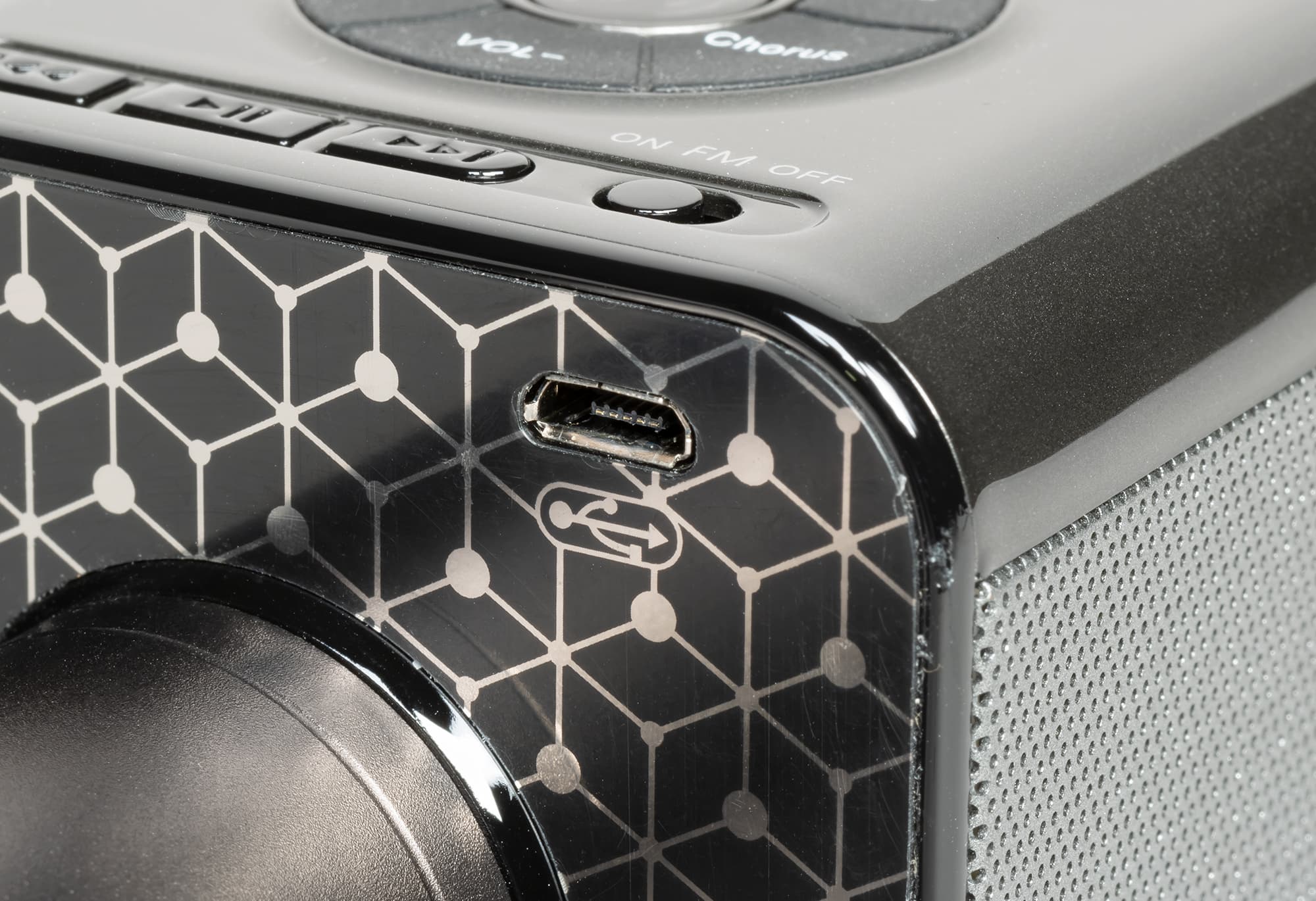 На сторонах «кубика» расположены пульт управления, декоративная панель с логотипом, а также решетки, скрывающие два динамика. О размерах последних производитель ничего не говорит. Но судя по габаритам корпуса и тому, что удалось разглядеть сквозь сетку, их диаметр составляет стандартные для таких устройств 40 мм.