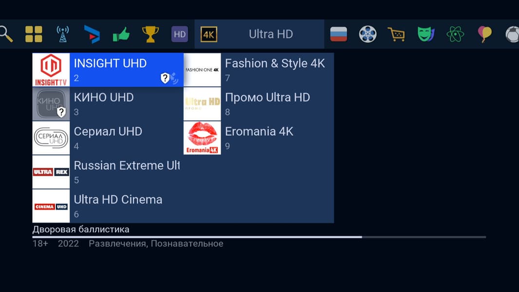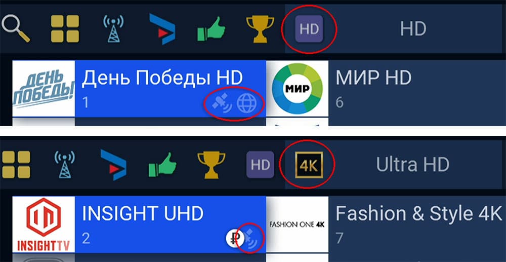 Доступность обоих источников легко определить по наличию пиктограмм на карточке каждого канала. Если в дополнение к значку спутника имеется пиктограмма земного шара — значит, просмотр канала возможен как со спутника, так и через интернет. Можно видеть, что у 4K-каналов пиктограмма шарика отсутствует.