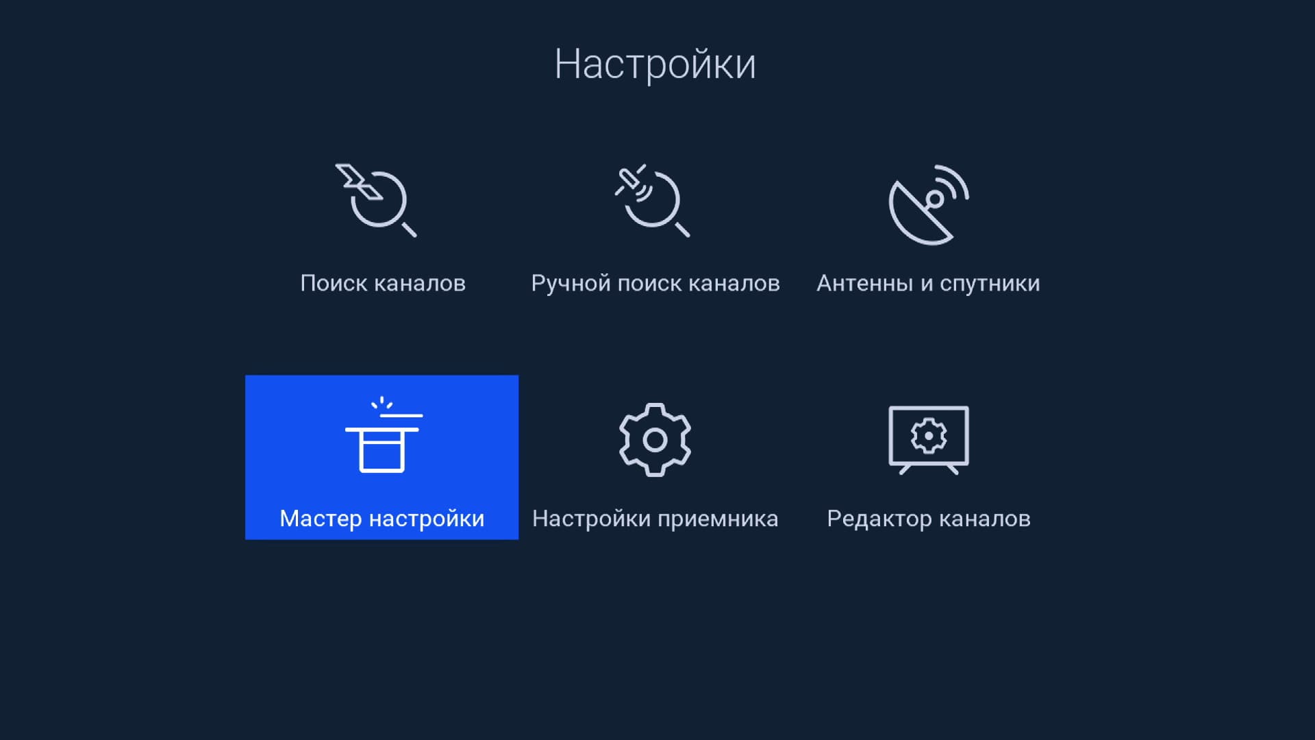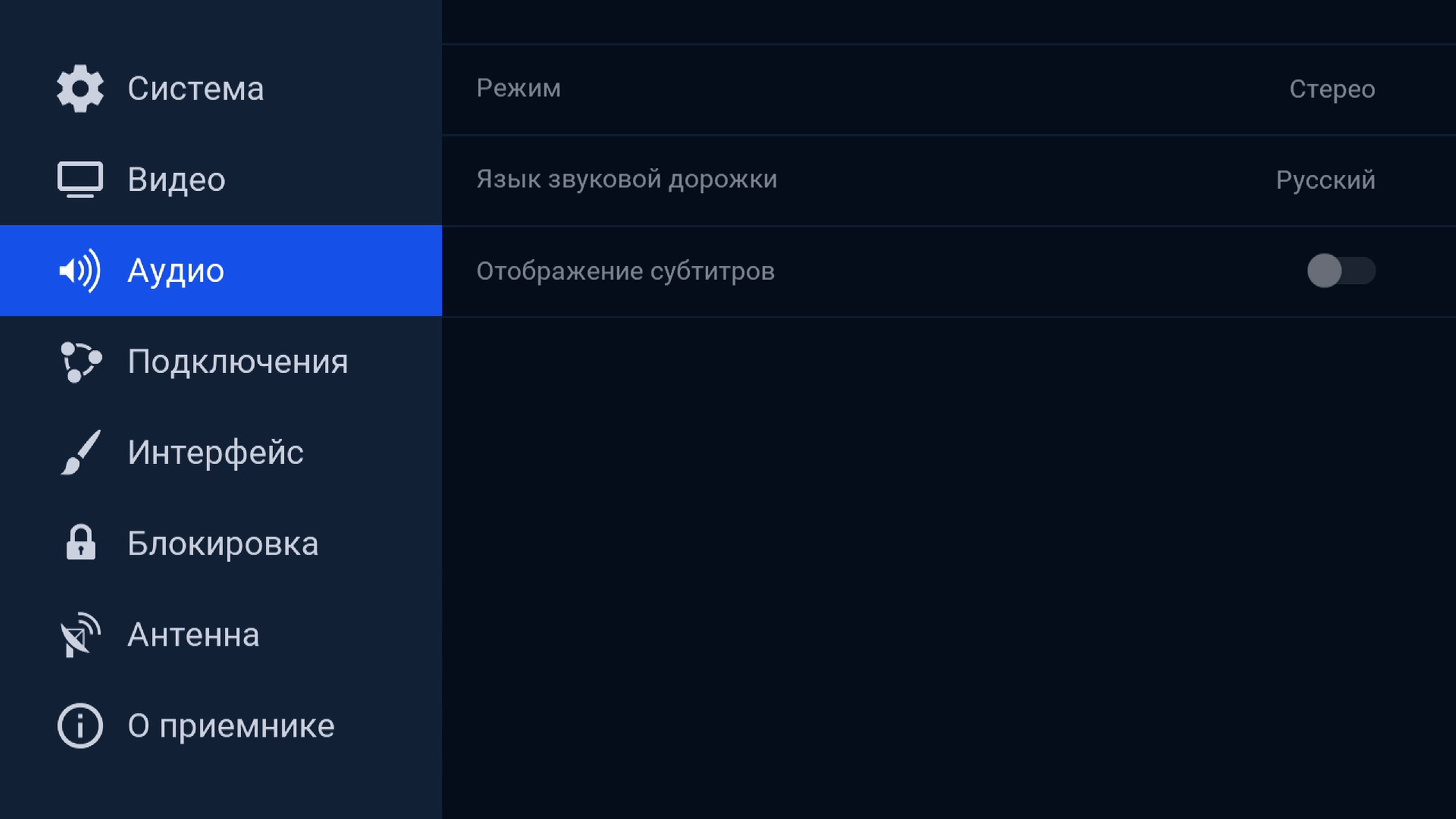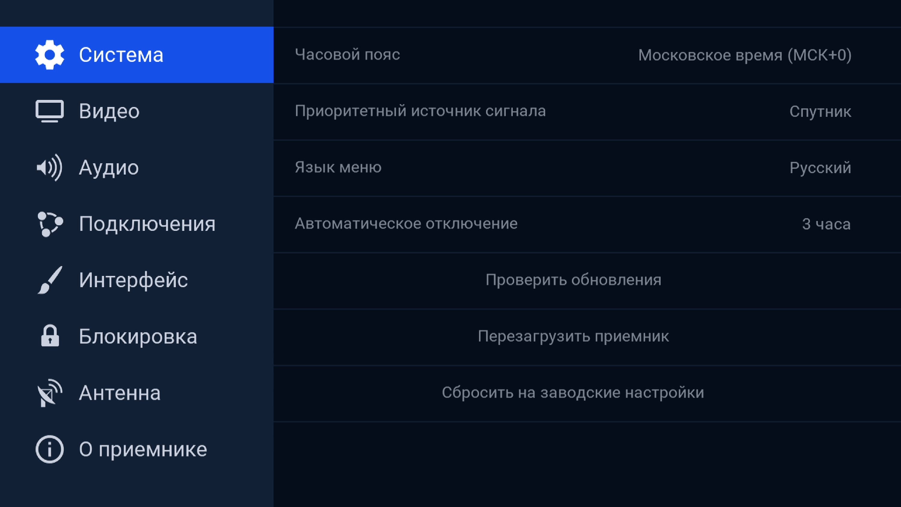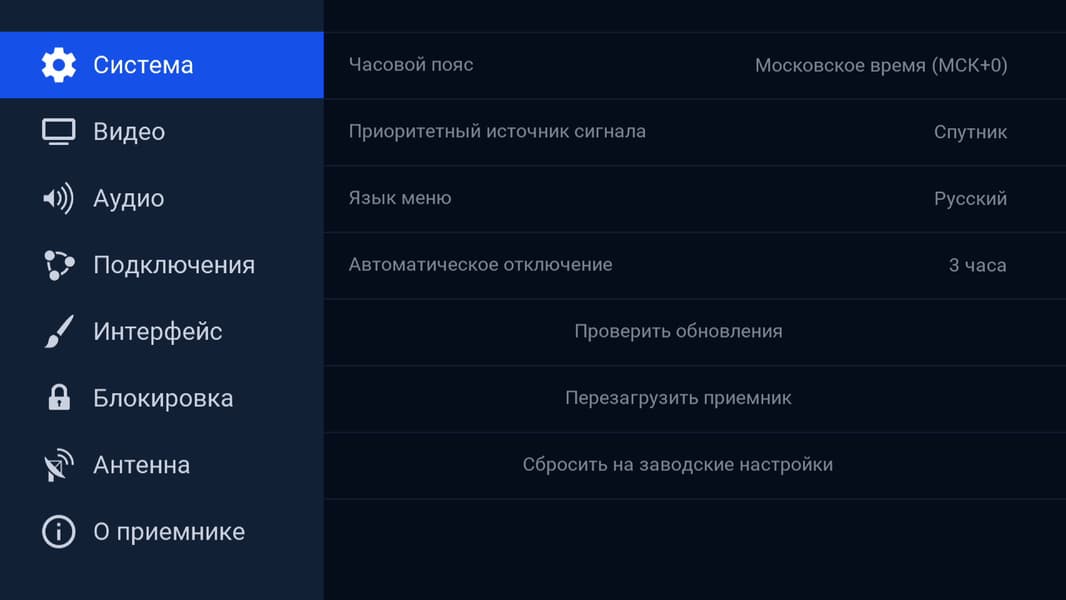 Все прочие настройки собраны под одной иконкой, она так и называется — Настройки приемника. Здесь можно изменить системные, видео- аудио и сетевые параметры.