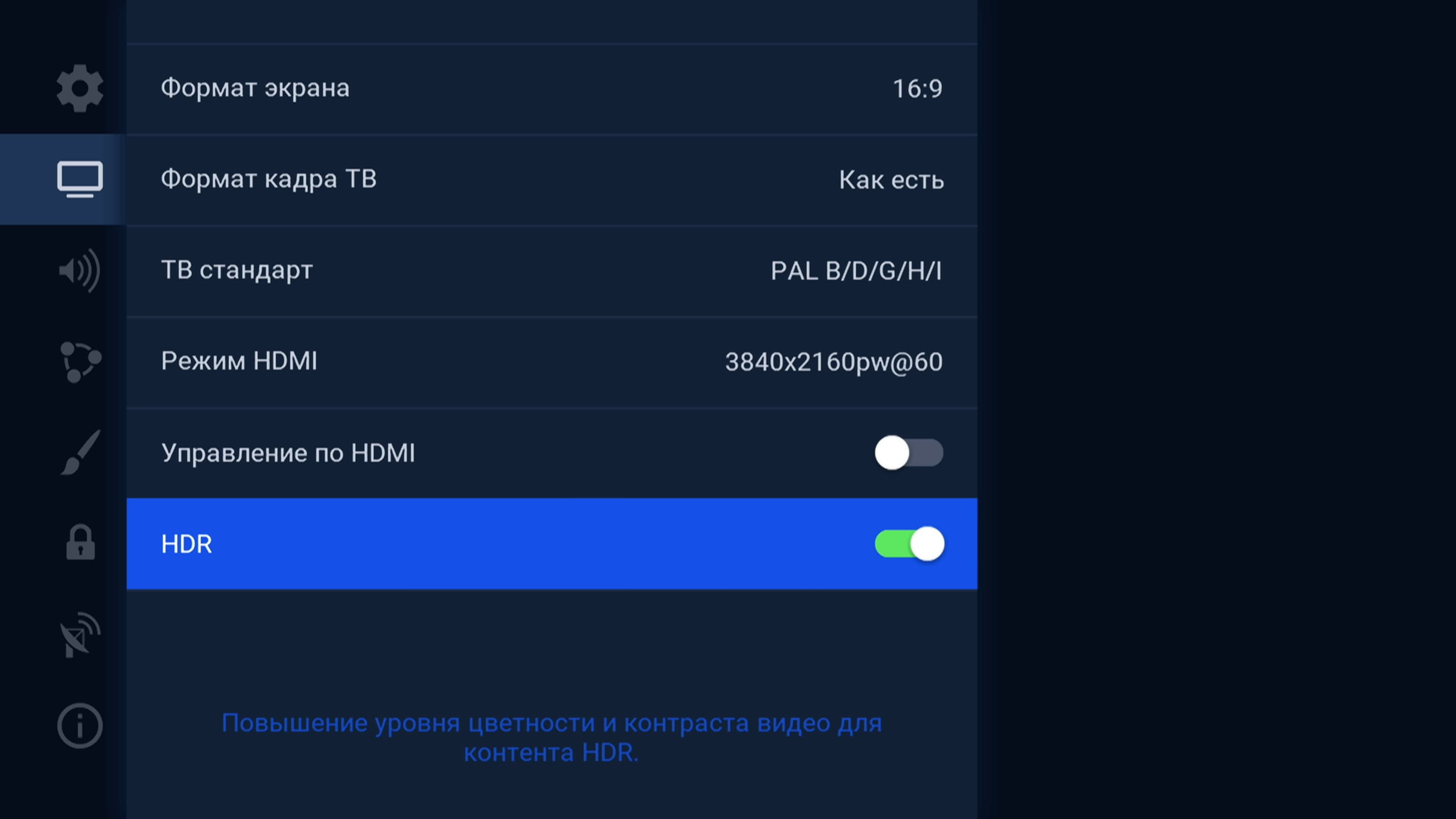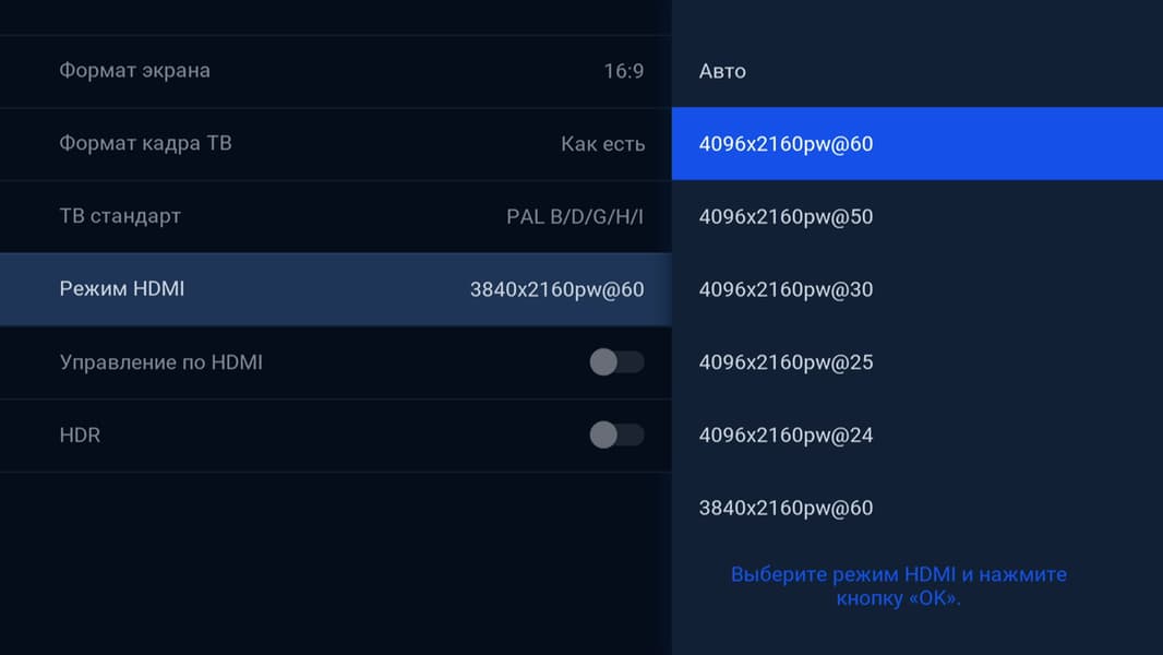 Отметим такую особенность приставки, как возможность трансляции сигнала на ТВ с нестандартным соотношением сторон (4096×2160, DCI 4K), а также поддержку технологии HDR. Признаться, это было удивительно — обнаружить столь продвинутые функции в простом с виду приемнике.