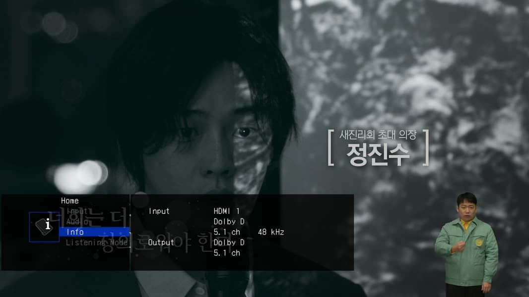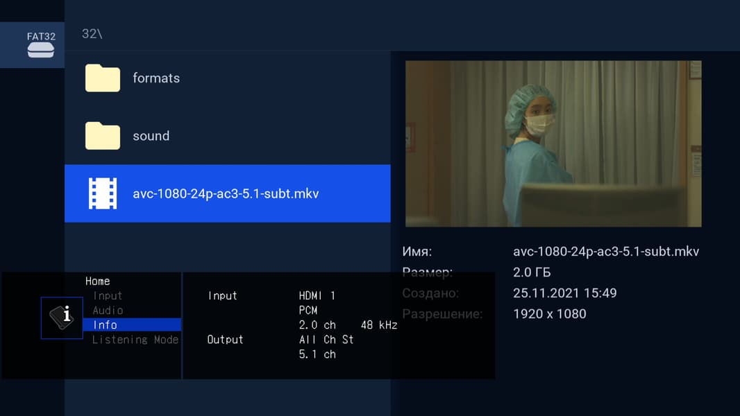 Проверка аудиовывода производилась с помощью аудиоресивера, который на своем видеовыходе поверх картинки отображает информацию о поступающем аудиопотоке. Наша приставка устроена так, что при воспроизведении многоканального Dolby Digital звука через аудиоресивер, мы обнаружим трансляцию оригинального звука — многоканальный Dolby Digital.