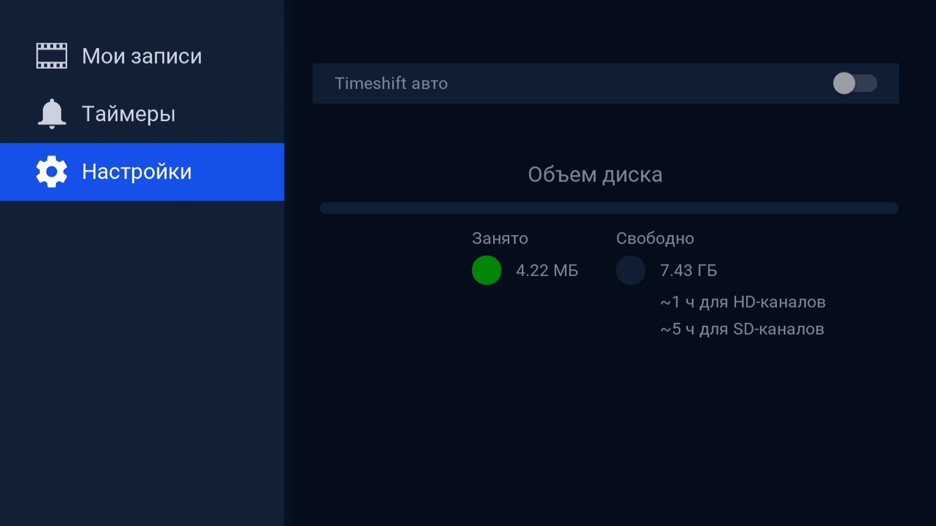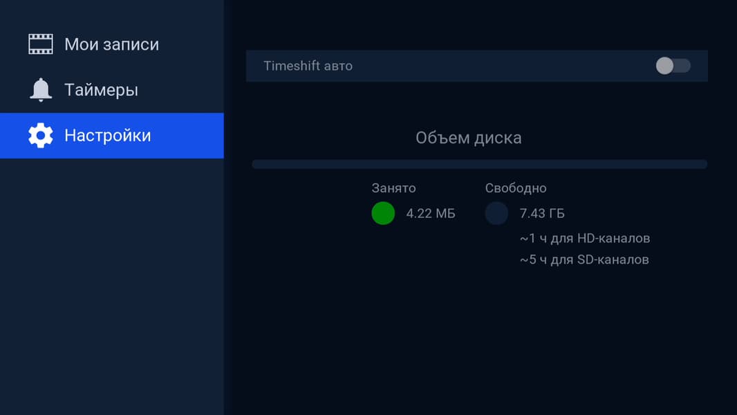 В большинстве телевизионных приставок имеется функция записи эфира. Наша приставка — не исключение, здесь тоже имеется аналогичное приложение. Правда, необходимость в нем теперь видится сомнительной, поскольку многие каналы доступны не только в прямом эфире, но и в архиве, который хранится удаленно, в облаке Триколора. Такая возможность определяется правообладателем контента, он же регулирует суровость ограничений. Например, какие-то каналы ограничивают длительность своего архива, а у центральных федеральных каналов архив почему-то отключен напрочь.