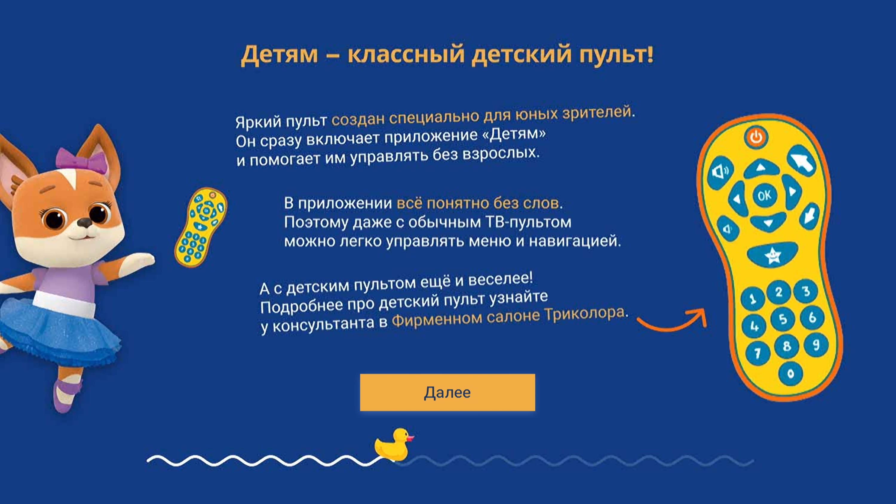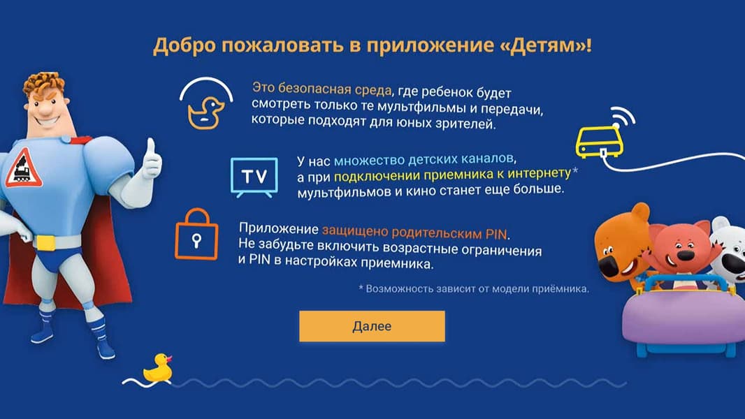 Рассмотрим работу приложения с незамысловатым названием: Детям. Иконка данного приложения вынесена в главное меню приставки. При первом запуске на экран будет выведен обучающий курс, в котором рассказывается о преимуществах сервиса.