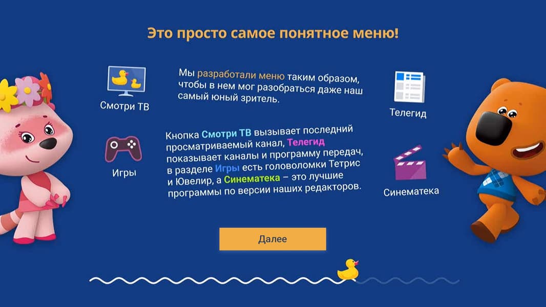 Интерфейс приложения напоминает устройство главного экрана приемника, где имеются подборки контента и иконки, ведущие к тем или иным функциям: списку детских ТВ-каналов, телевизионному гиду и двум нехитрым играм, «Ювелир» и вездесущий «Тетрис».