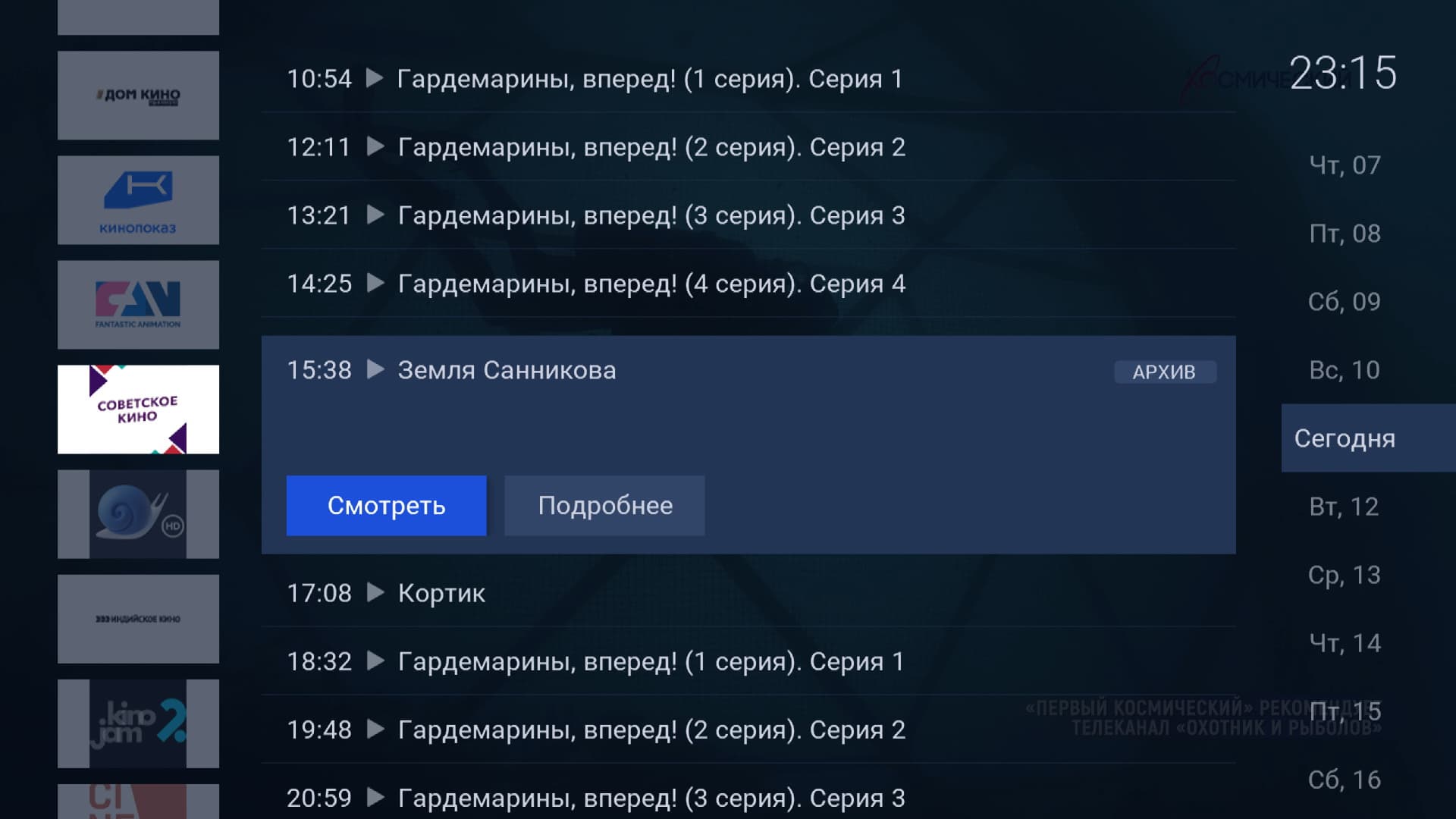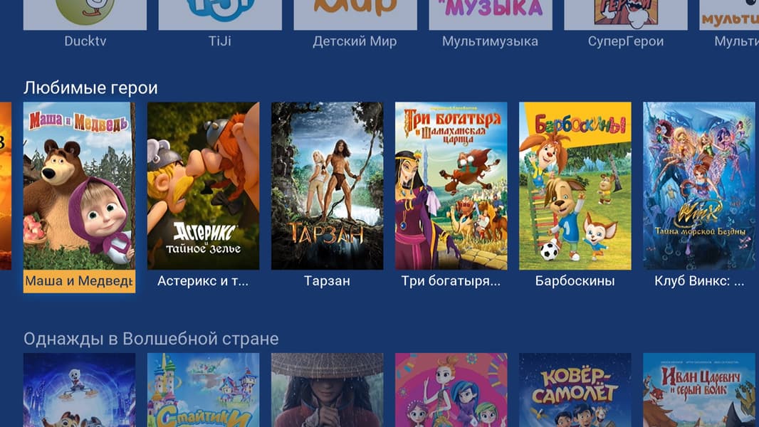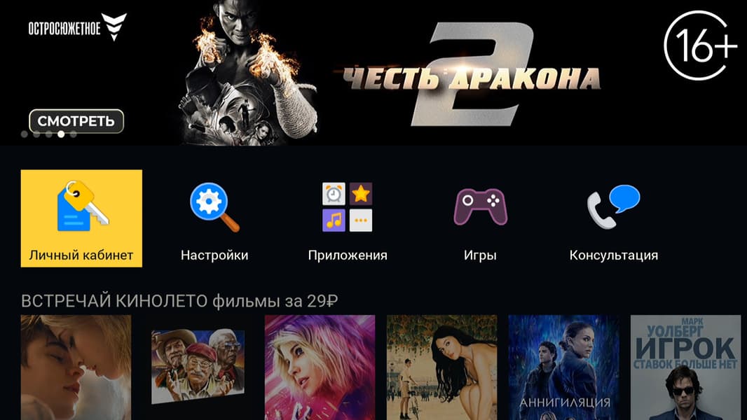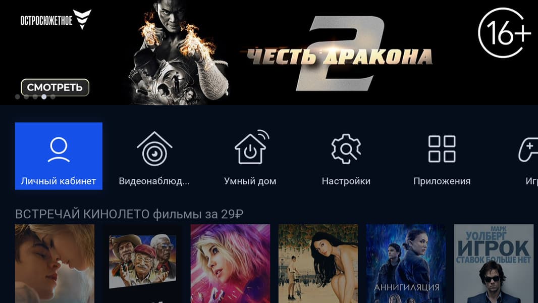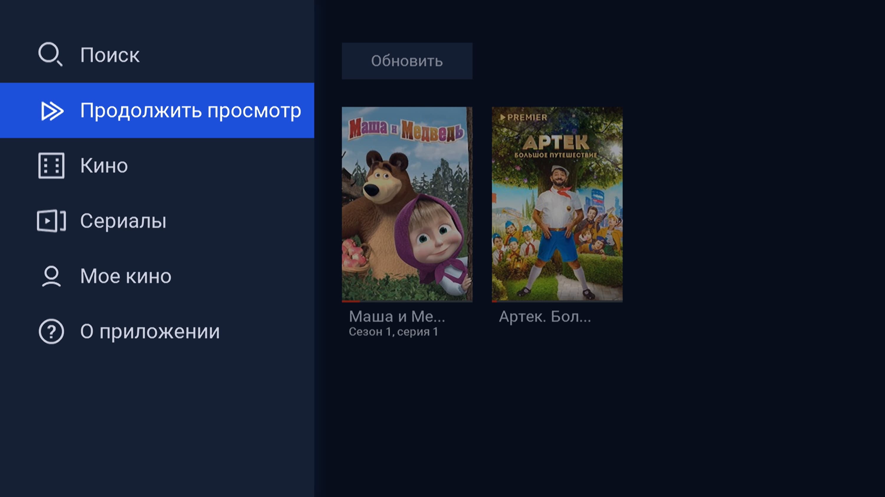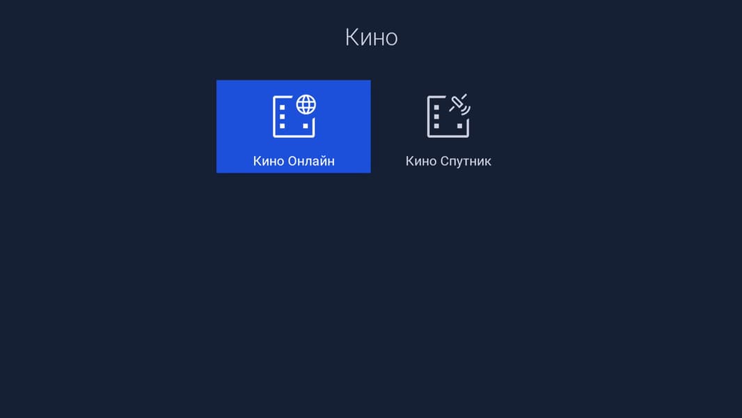 Приложение «Кино» устроено несколько иначе. Существует две версии приложения, они различаются лишь источником: интернет или спутник. В приложении доступен поиск фильмов по названию, имеется даже пункт «Продолжить просмотр», где будут накапливаться недосмотренные фильмы, сериалы и мультики.