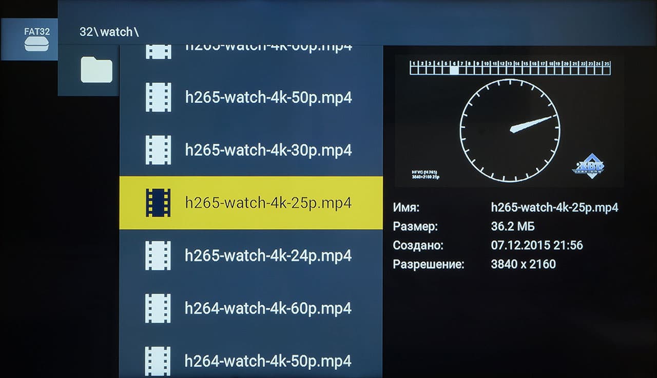 Прежде всего проведем традиционные тесты на корректное воспроизведение видео с разной частотой кадров. Плеер рассчитан на работу с видео 4K, но это не означает, что мы оставим без внимания «старомодное» Full HD. Запускать будем поочередно все тестовые файлы, имеющие частоту от 24 до 60 к/с. Для воспроизведения используем встроенный программный плеер с файловым браузером. Впрочем, других вариантов воспроизведения пользовательского локального контента приставка все равно не предлагает.