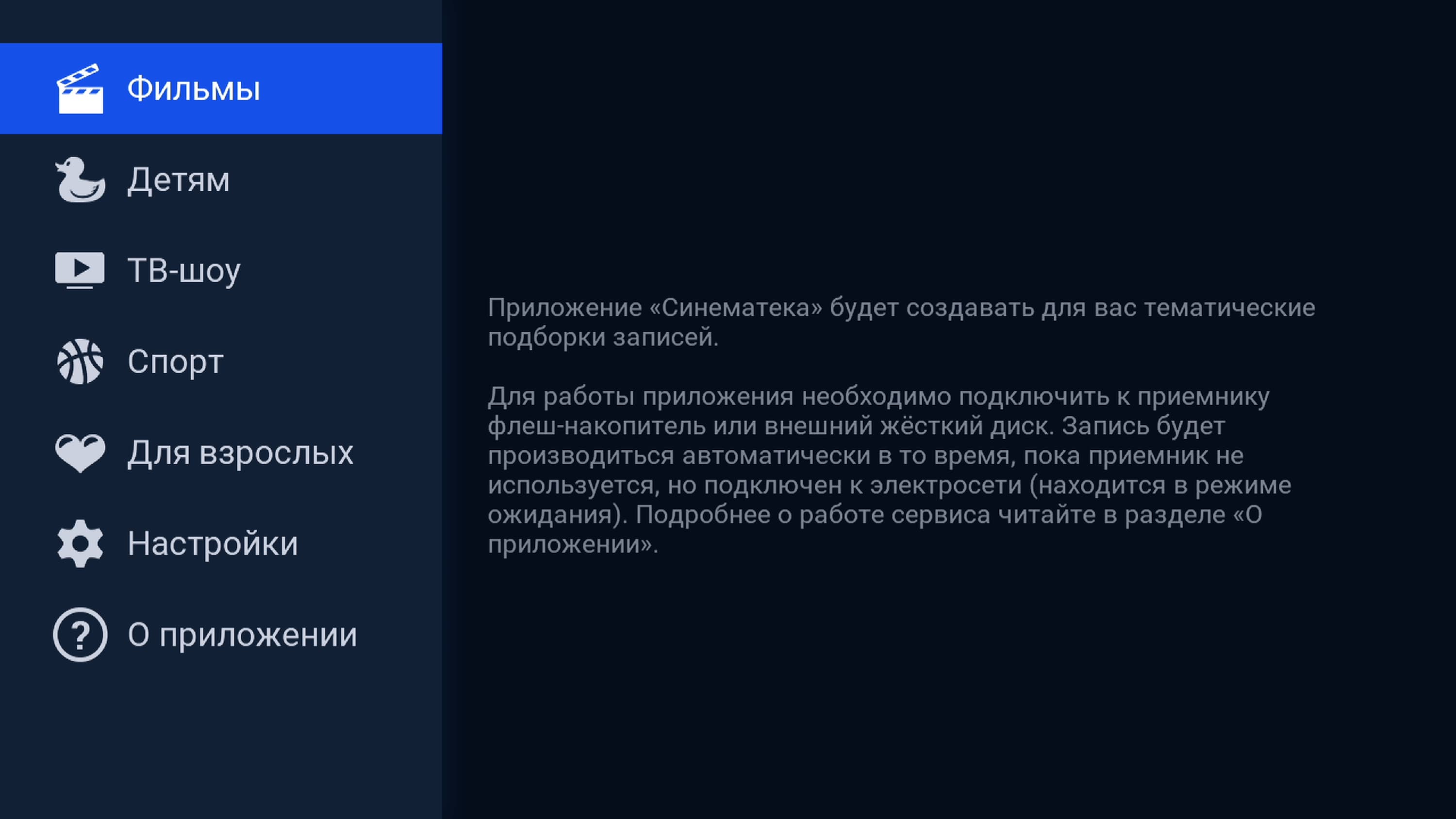 Здесь наша приставка тоже не ударяет лицом в грязь, предоставляя сразу несколько сервисов. Они объединены в одно приложение с названием «Синематека» и предлагают просмотр контента разной тематики. Кстати, «Синематека» будет работать только при наличии спутникового подключения.