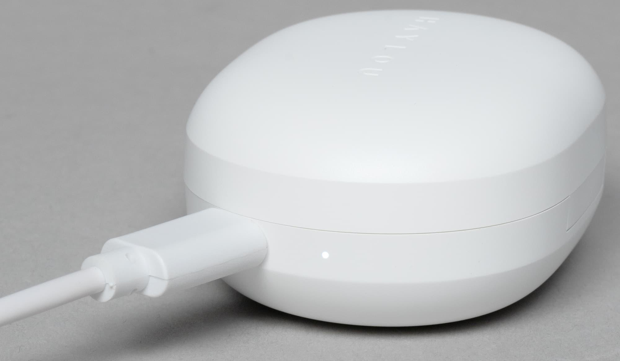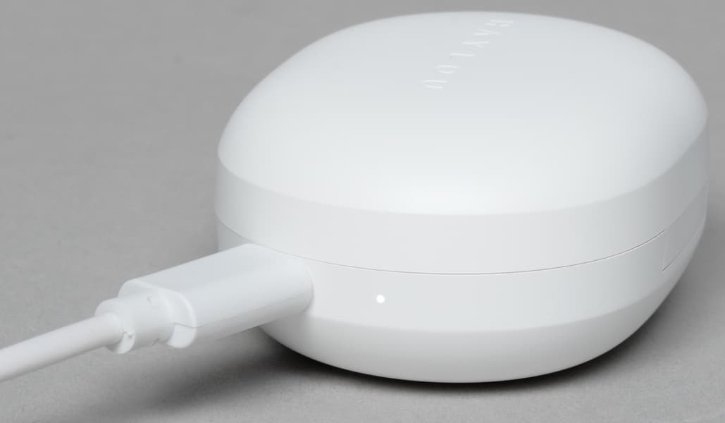Наушники удерживаются магнитами, но не слишком-то плотно: стоит немного потрясти футляр, как внутри раздается слышимый стук. Однако при открытии крышки гарнитура не выпадает и остается на своем месте даже если перевернуть кейс, так что поводов для критики нет — не будем слишком строги с крайне бюджетным устройством. В основании «палочки» видны светодиодные индикаторы, включающиеся во время начала зарядки и активации режима сопряжения.