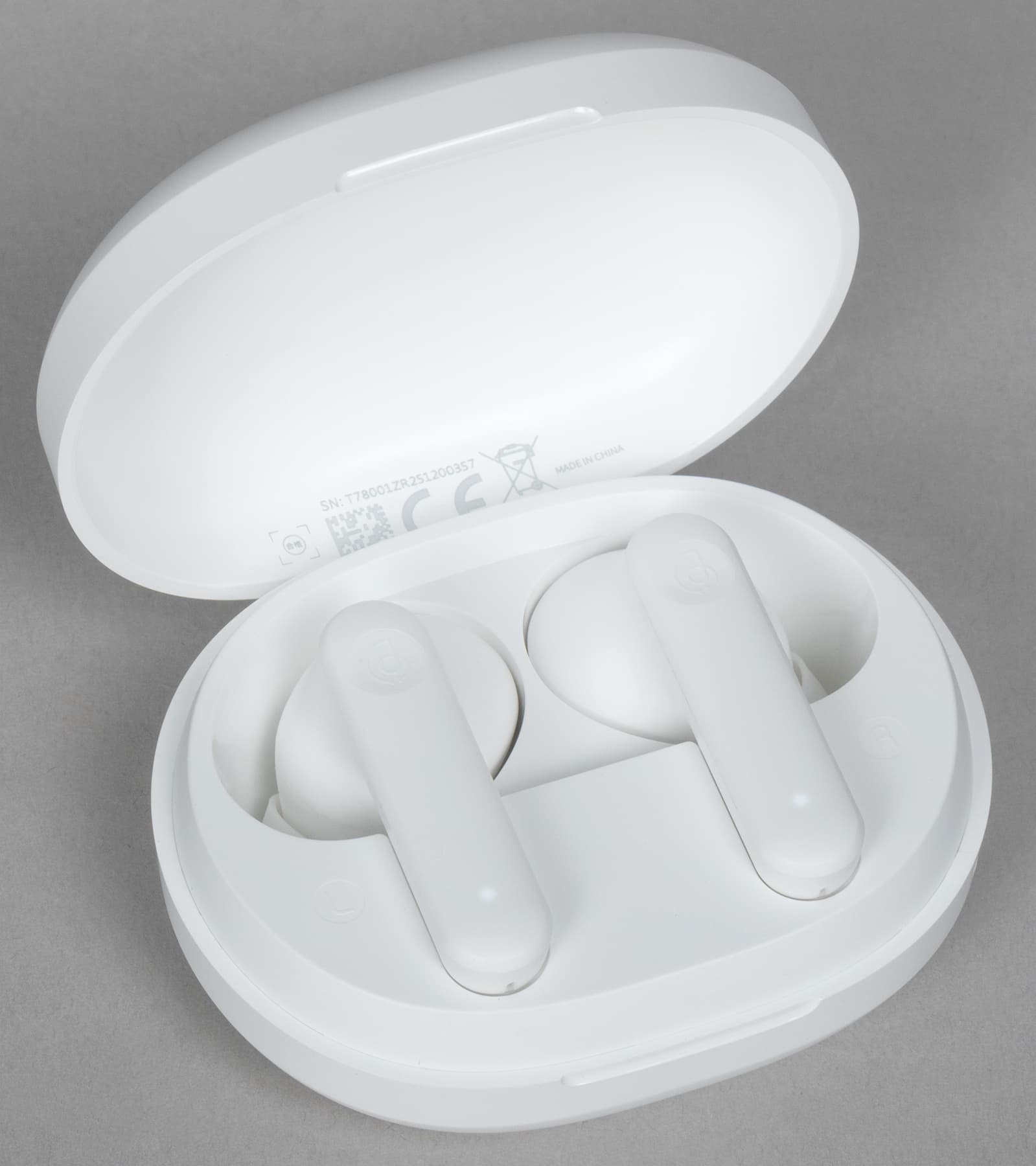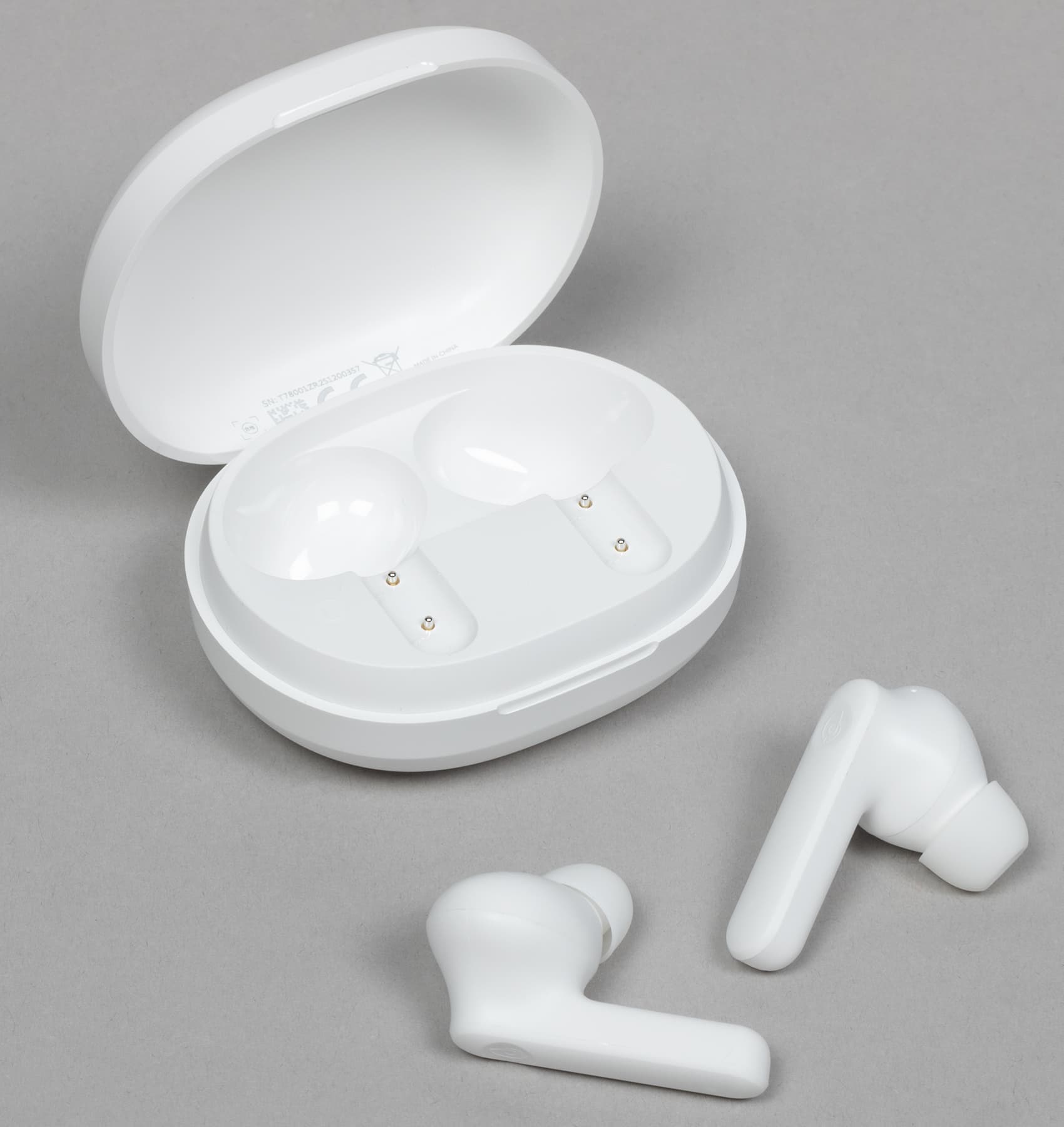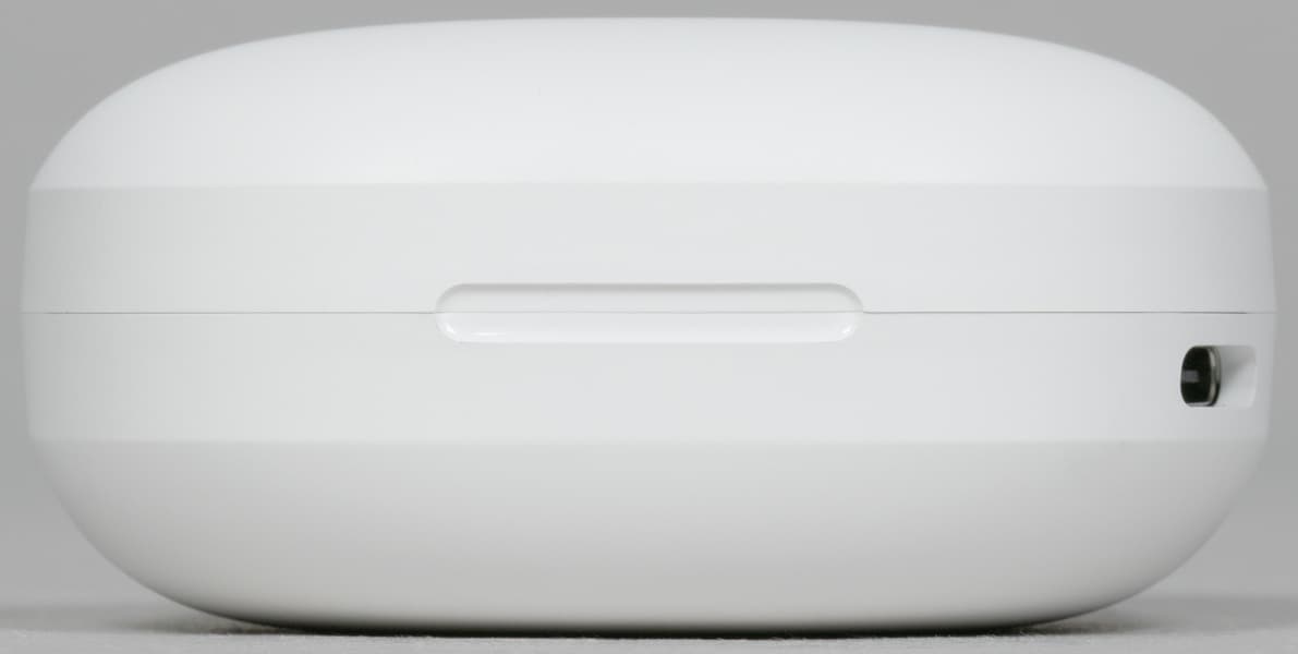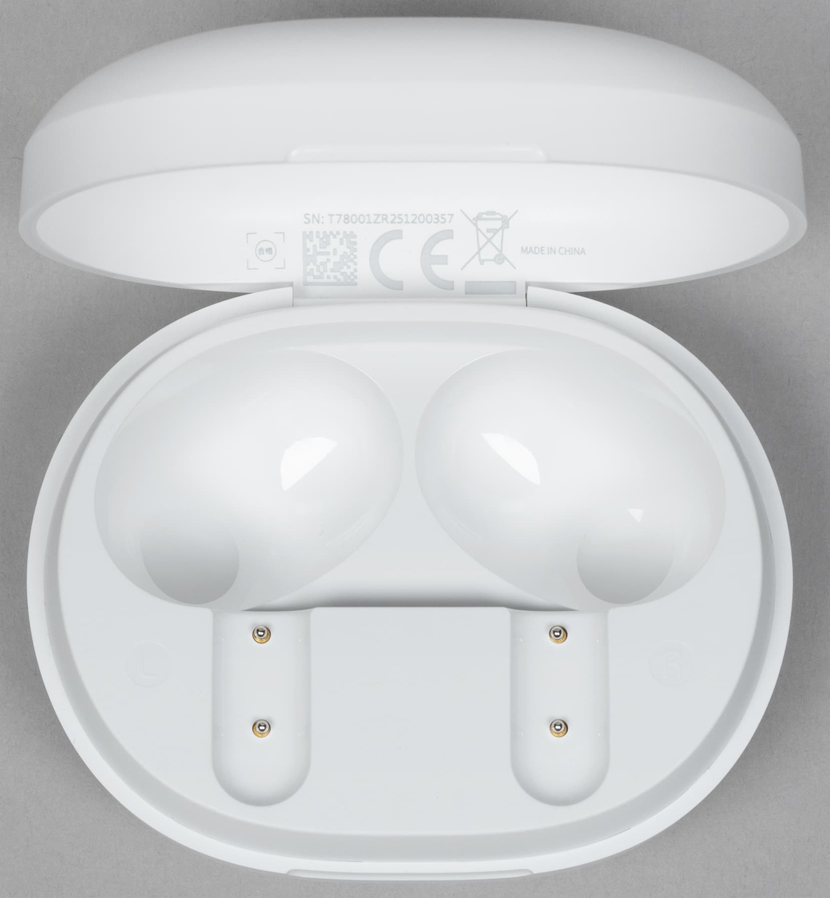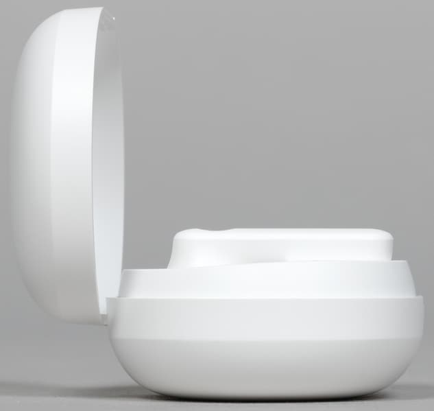 Внутри слотов для наушников видны подпружиненные контакты для зарядки, на основание крышки изнутри нанесены данные об устройстве и логотипы систем сертификации. Поверхность углублений сделана из глянцевого пластика, легко «собирающего» отпечатки пальцев — к нему лучше не прикасаться.