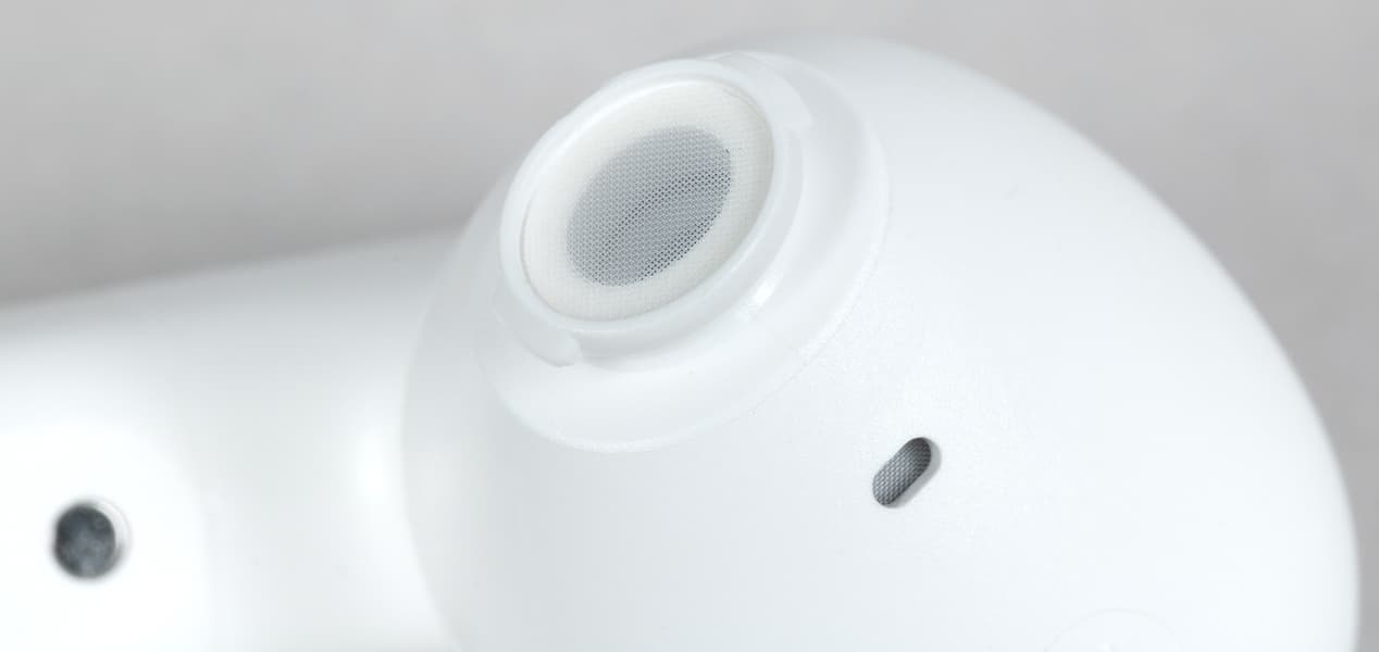 На округлой части сверху расположены отверстия микрофонов, служащих для работы системы активного шумоподавления.