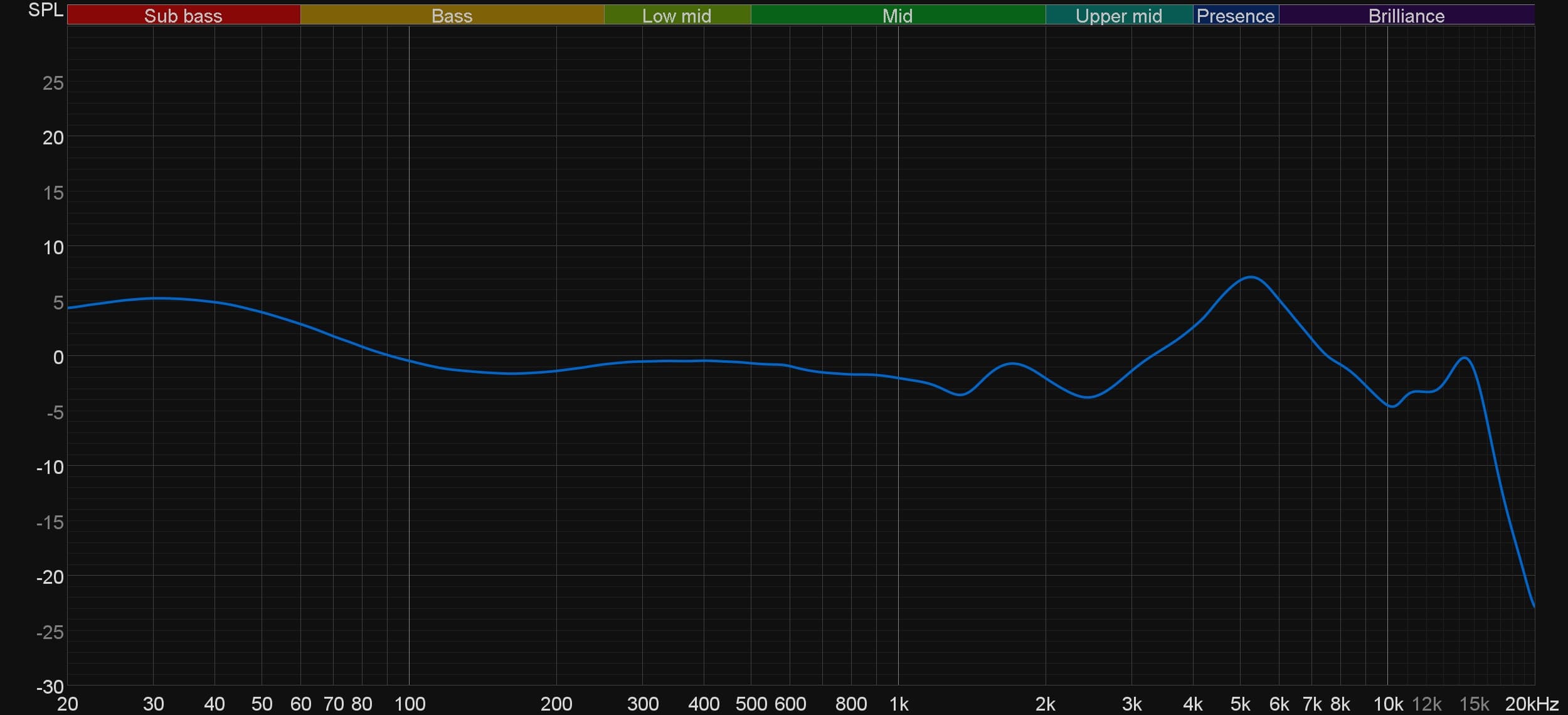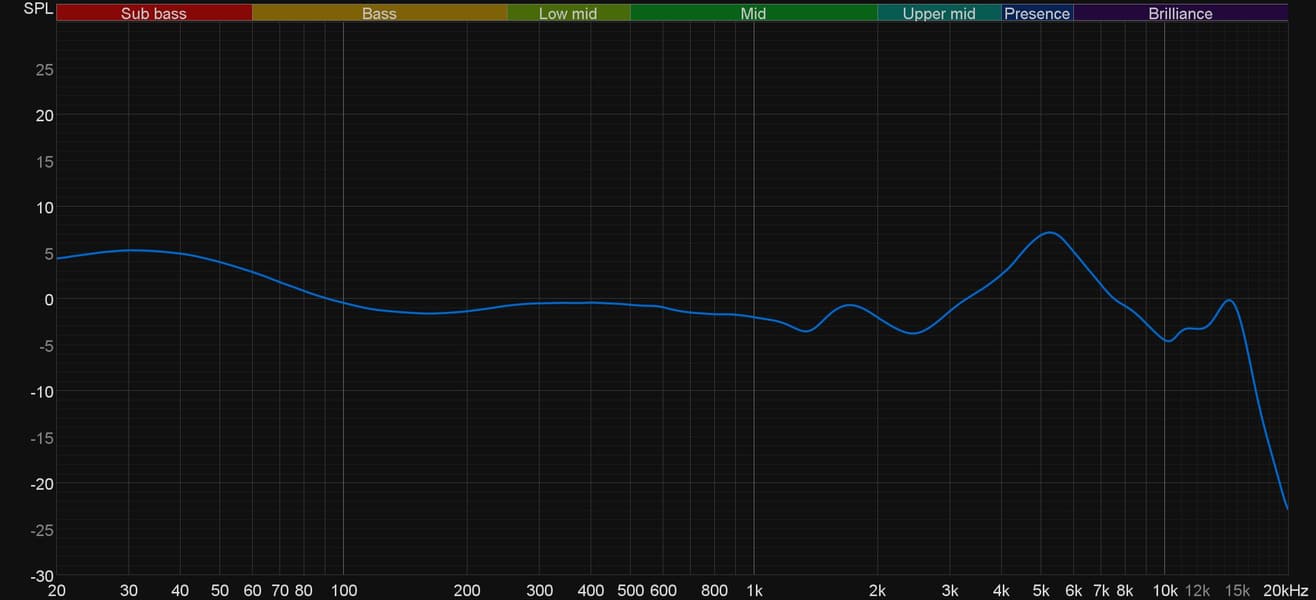 График АЧХ показан на фоне целевой кривой, предоставленной производителем используемого стенда. Она является адаптированным под конкретное устройство аналогом так называемой «кривой Хармана», созданной командой Harman International под руководством доктора Шона Олива. Люди неодинаково воспринимают звук разной частоты, поэтому даже самые точные измерения могут не соответствовать реальному пользовательскому опыту. Для компенсации этих различий и используется целевая АЧХ. Близкое к ней звучание оценивалось сотнями участников экспериментов как нейтральное, сбалансированное, естественное и так далее.