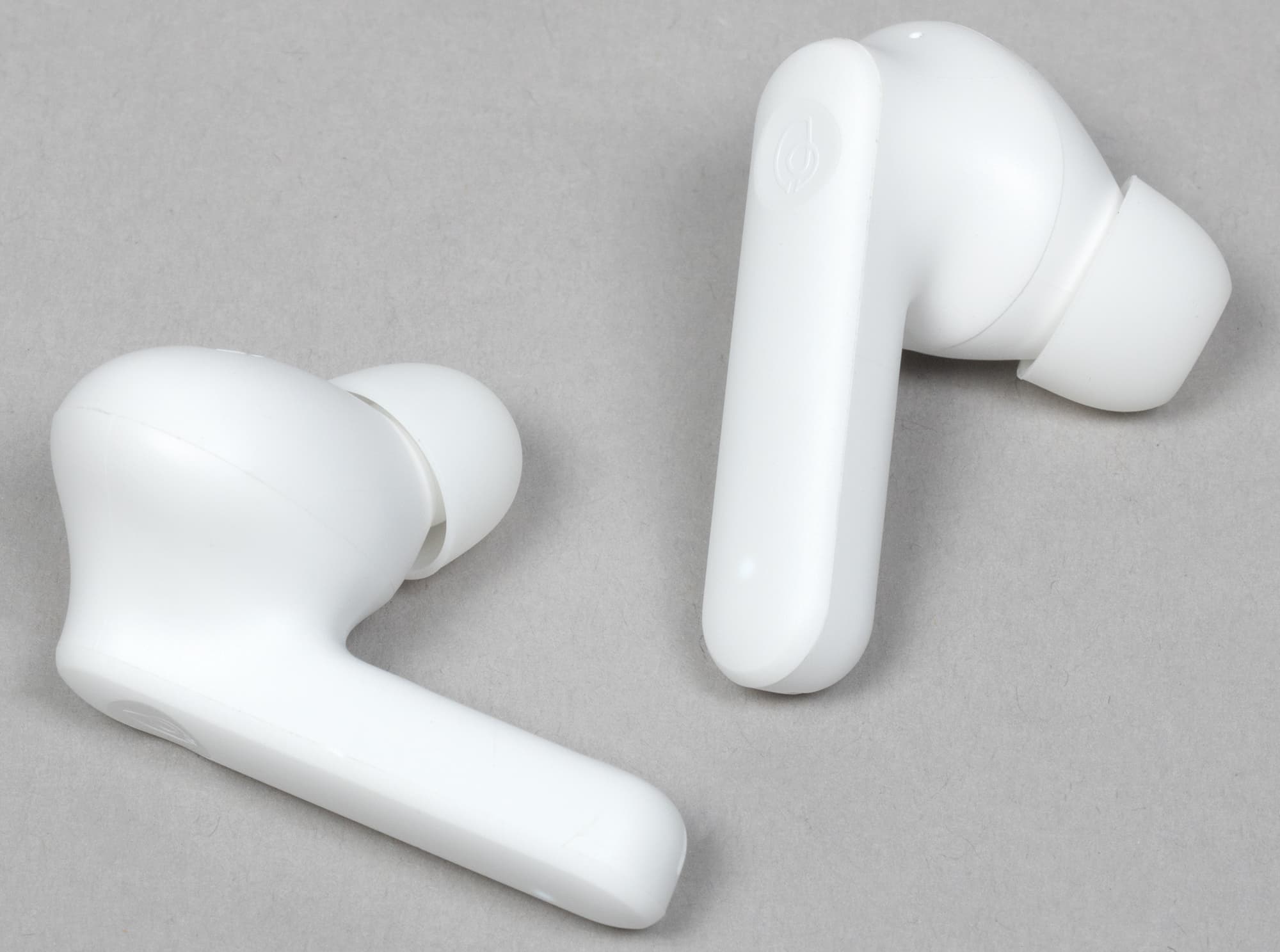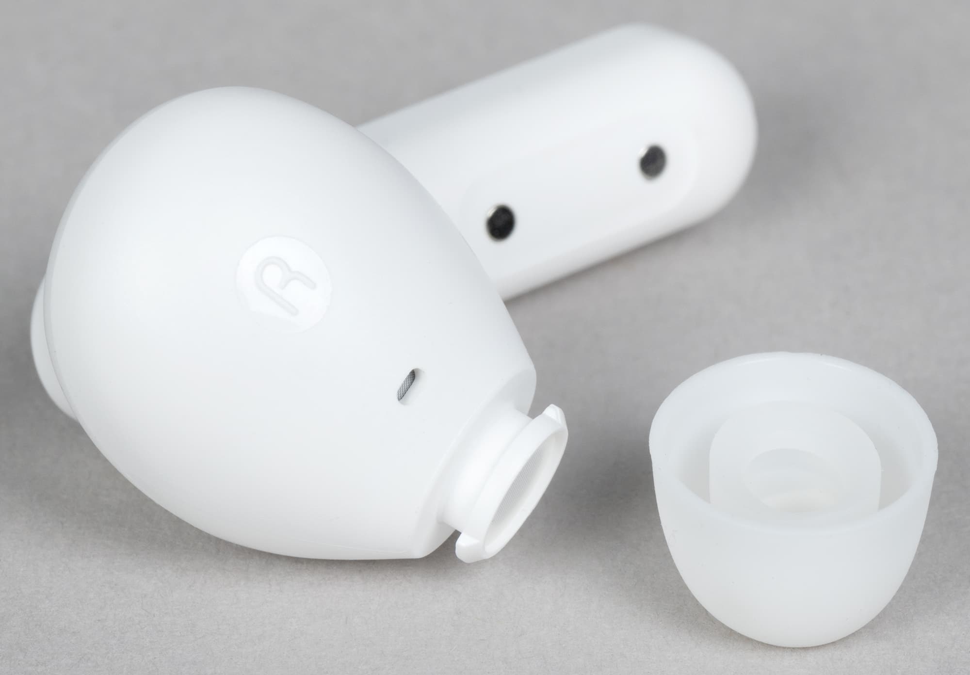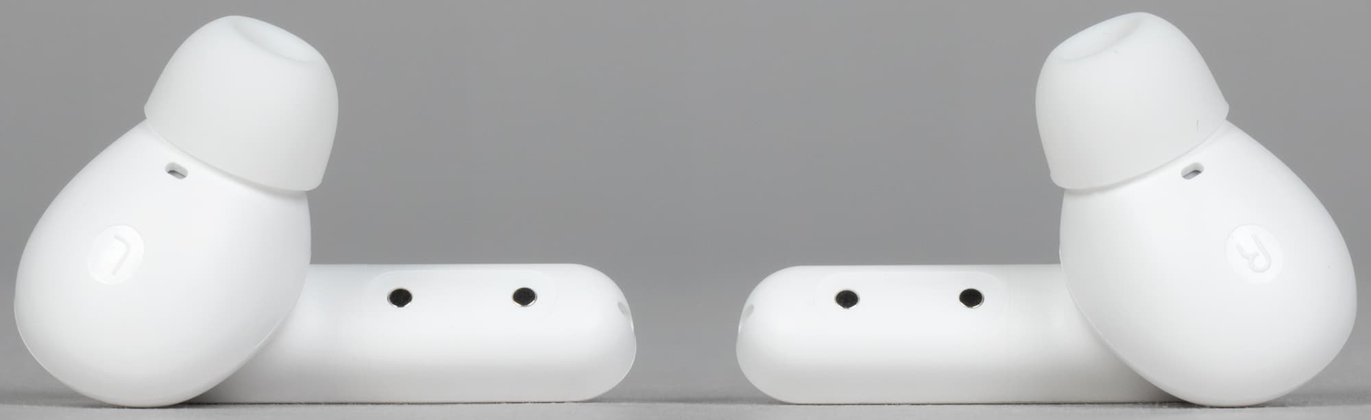 Выполнена гарнитура в белом цвете, других вариантов оформления мы пока не видели. Дизайн простой и приятный — от бюджетной гарнитуры мы большего и не ждем.